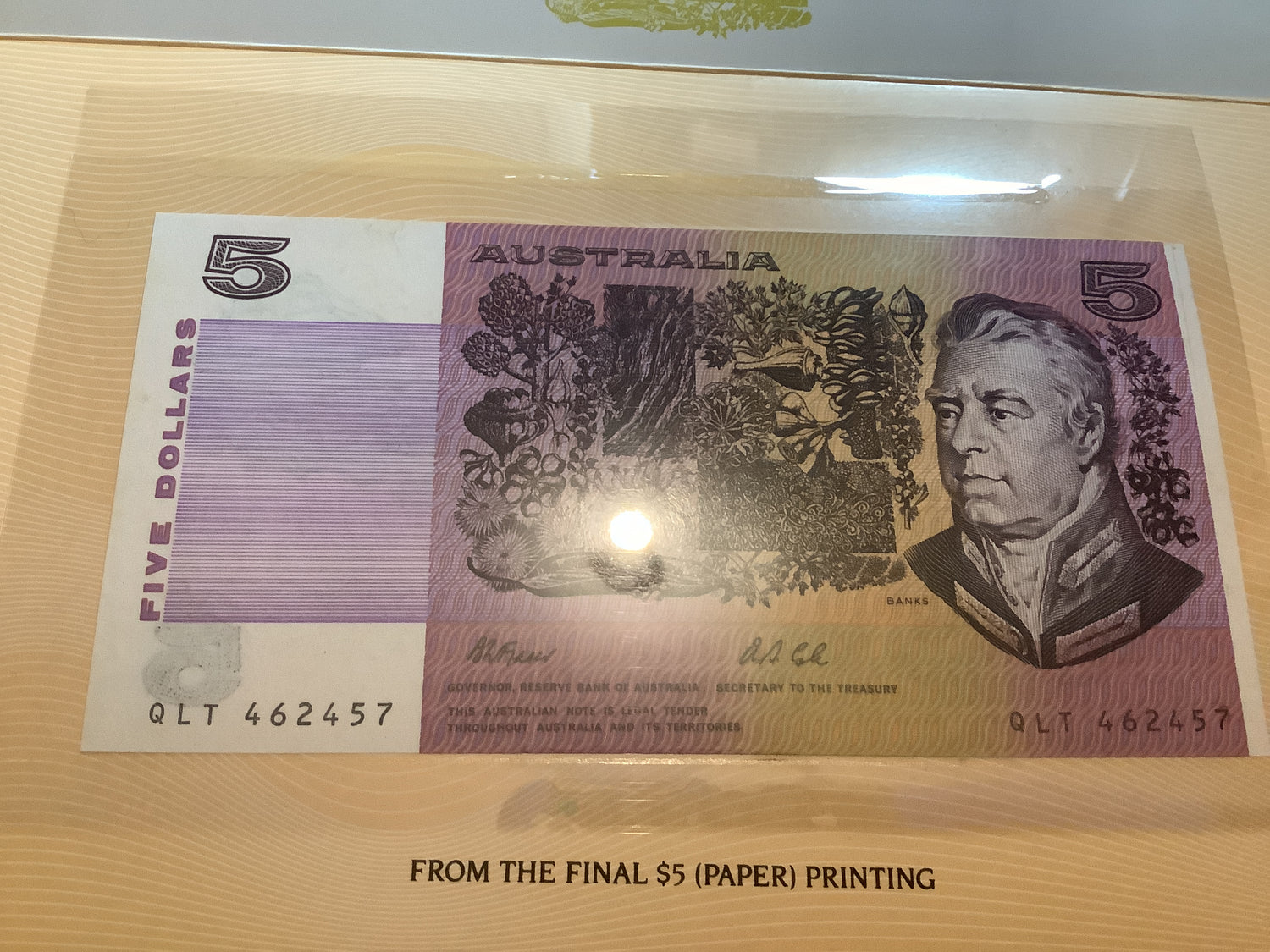 Released by Note Printing Australia in 1992, this 2-note set features both the paper and replacement polymer $5 note issues.