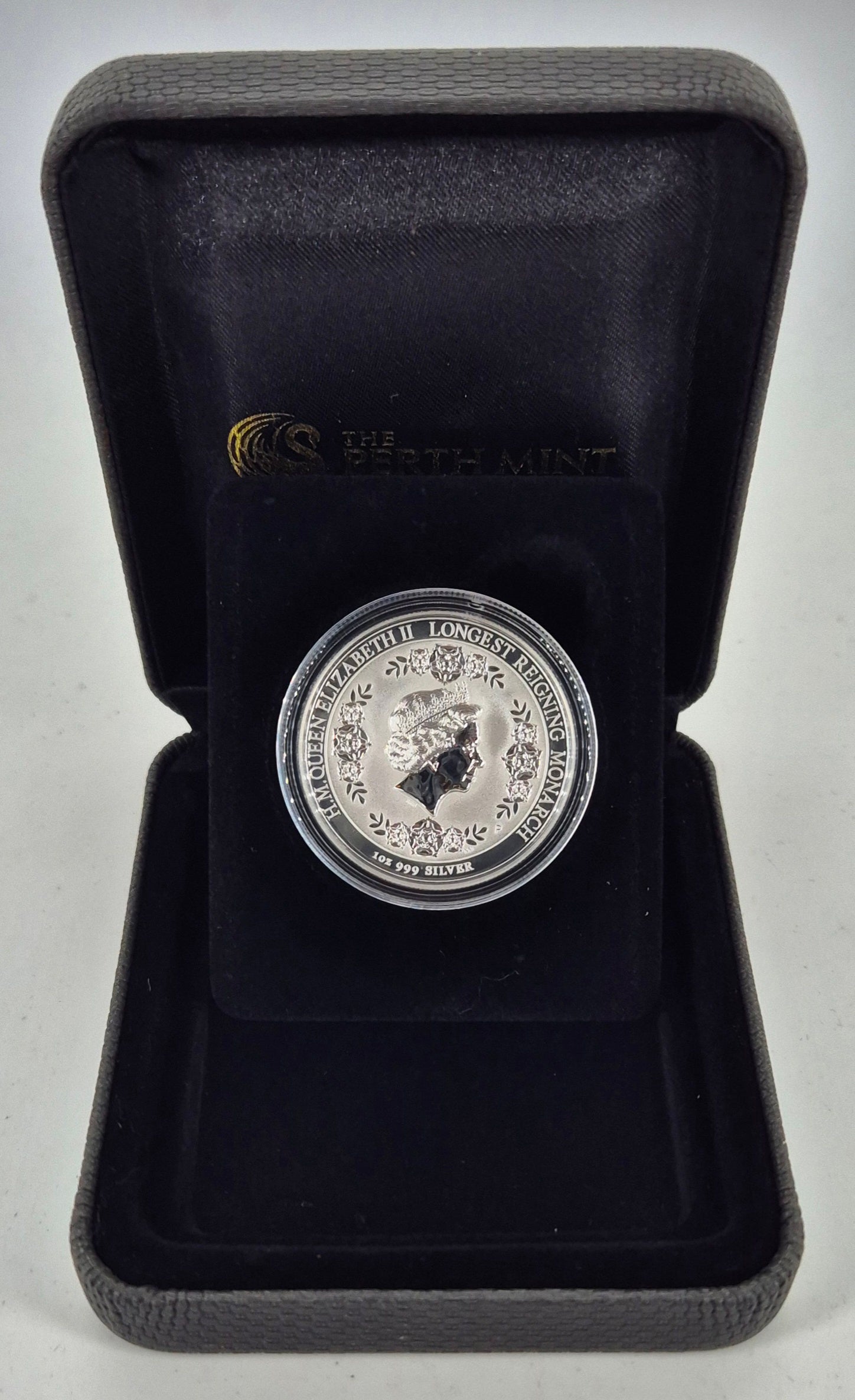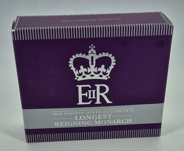 Struck by The Perth Mint, this beautifully rendered coin contains 1 troy ounce of 99.9% pure silver and features a unique intaglio-style design, where the engraving is recessed into the coin’s surface. The reverse design presents an elegant royal cipher and laurel wreath, accompanied by the inscription "Longest Reigning Monarch – 9 September 2015."