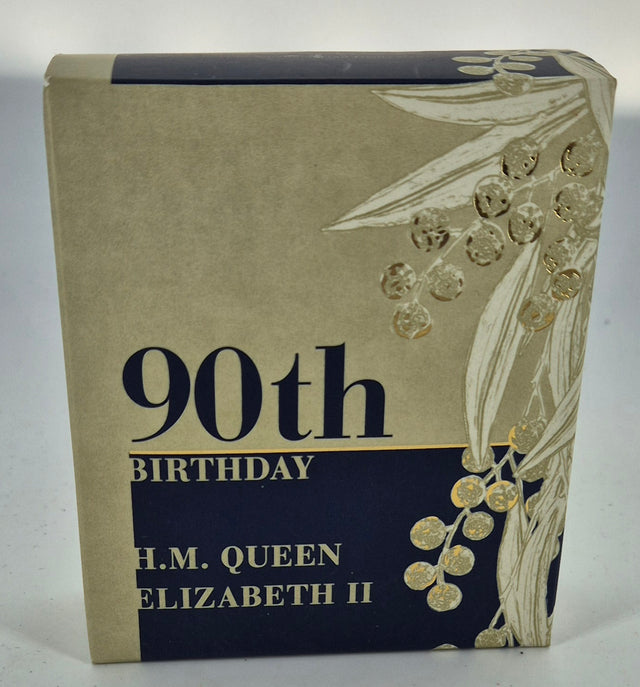 The reverse design showcases St Edward’s Crown, flanked by golden wattle, Australia’s national floral emblem. The inscription reads "H.M. QUEEN ELIZABETH II 90TH BIRTHDAY 21-4-2016", along with the Perth Mint’s ‘P’ mintmark. The obverse bears the effigy of Queen Elizabeth II by Ian Rank-Broadley.