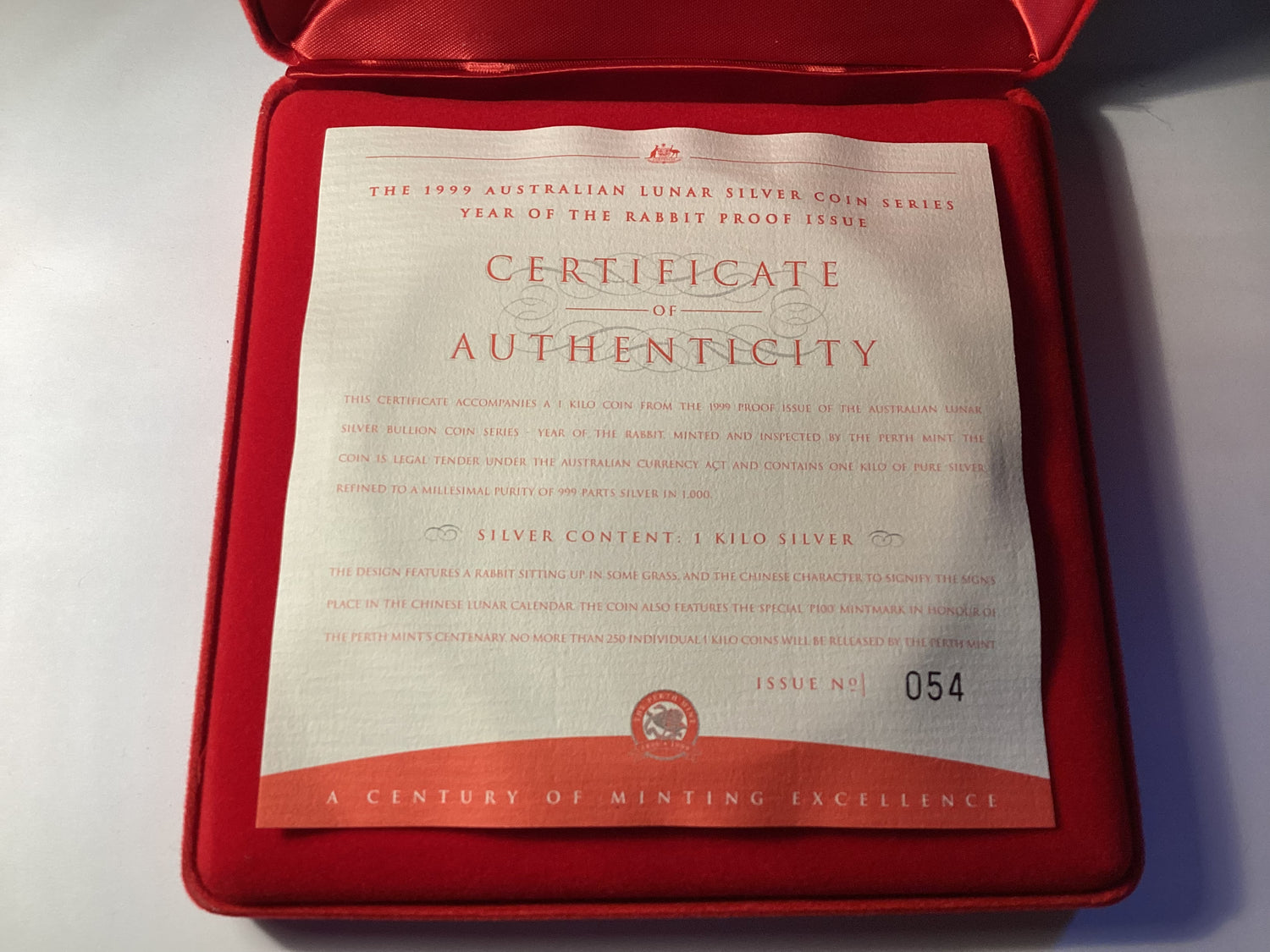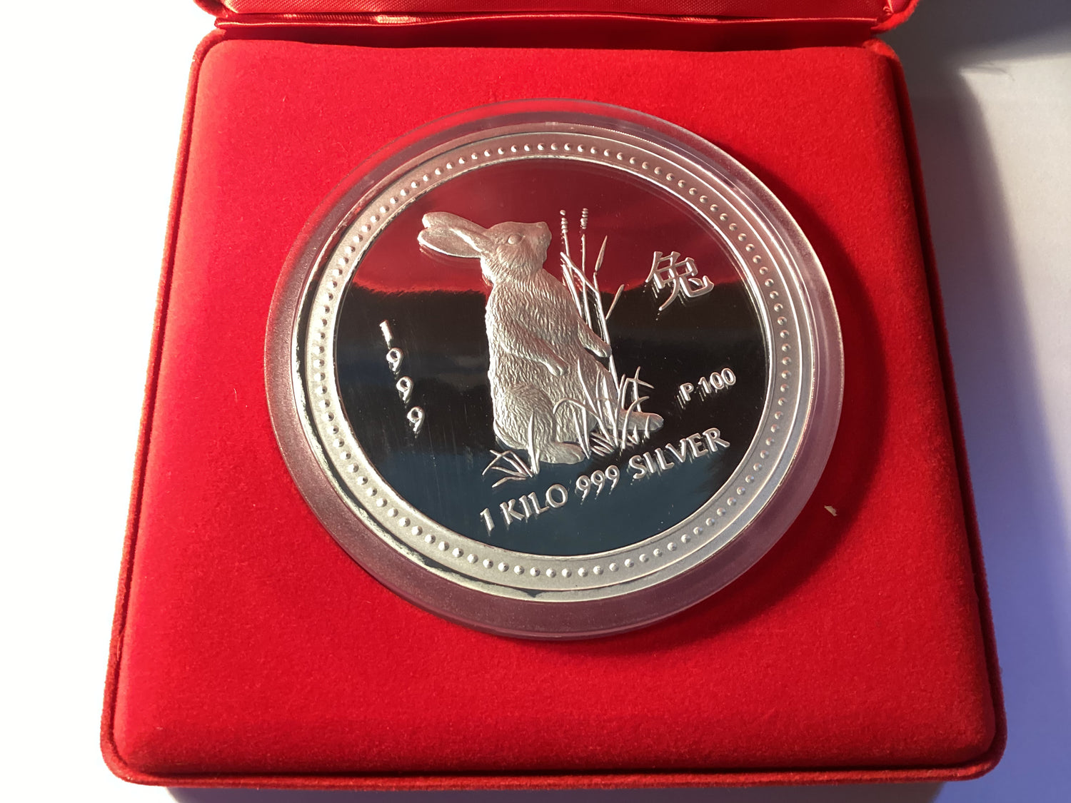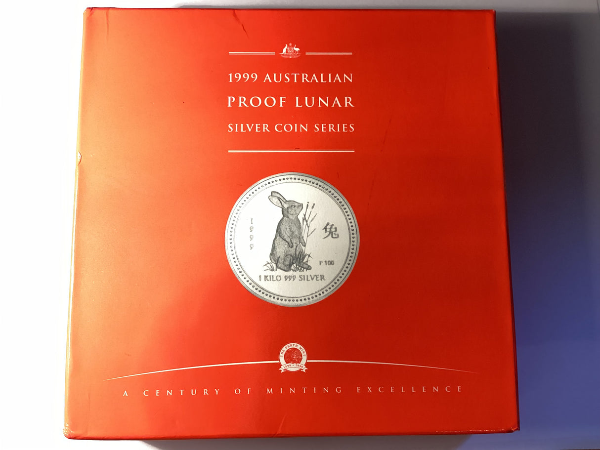 1999 $30 Australian Proof Lunar Series. Year of the Rabbit 1 Kilogram Silver Coin. is backordered and will ship as soon as it is back in stock.
