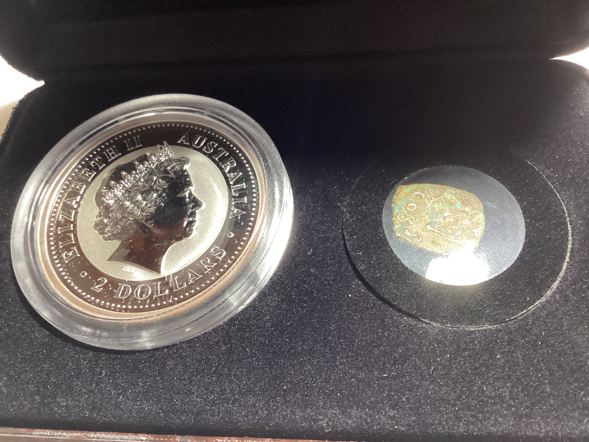 This two-coin set features a $2 2oz silver kookaburra with a hammered privy mark. The set also features a genuine bronze coin from the Byzantine Empire stuck between 518 and 630 AD.