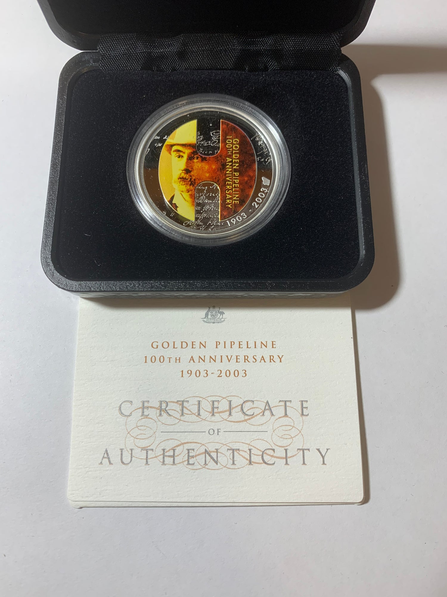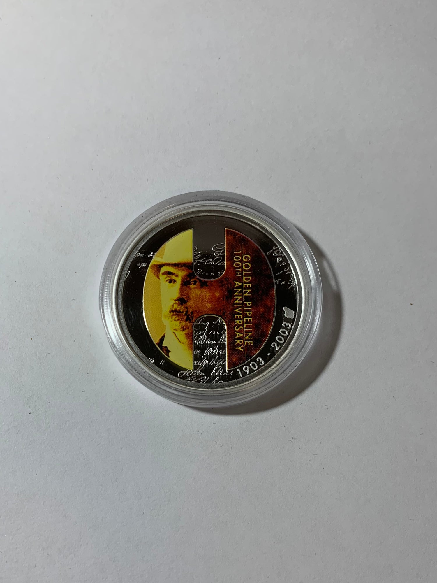The 2003 $1 1oz Silver Proof Coin commemorates the Golden Pipeline's 100th Anniversary (1903-2003).