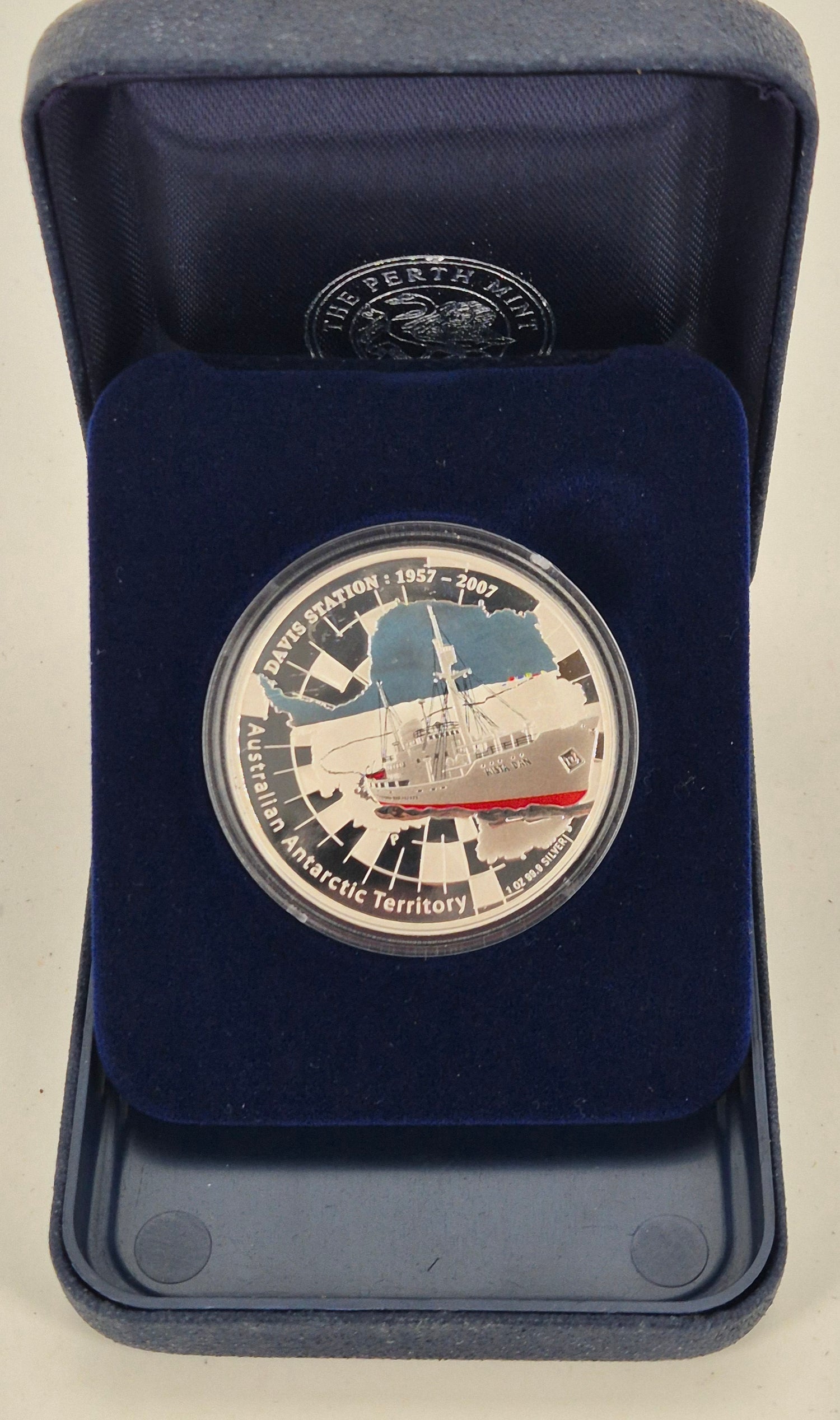 Issued by the Perth Mint in 2007, this 1oz silver proof coin commemorates Davis Station—Australia’s southernmost research base. Part of the Australian Antarctic Territory series, it is presented in a themed display case with full packaging.