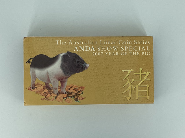 Issued by the Perth Mint as part of the highly sought-after Australian Lunar Series, the 2007 Year of the Pig ANDA Show Special Two-Coin Set is a remarkable collectible celebrating the Chinese zodiac. This exclusive release was created specifically for the ANDA (Australian Numismatic Dealers Association) Show, making it a prized addition for collectors.