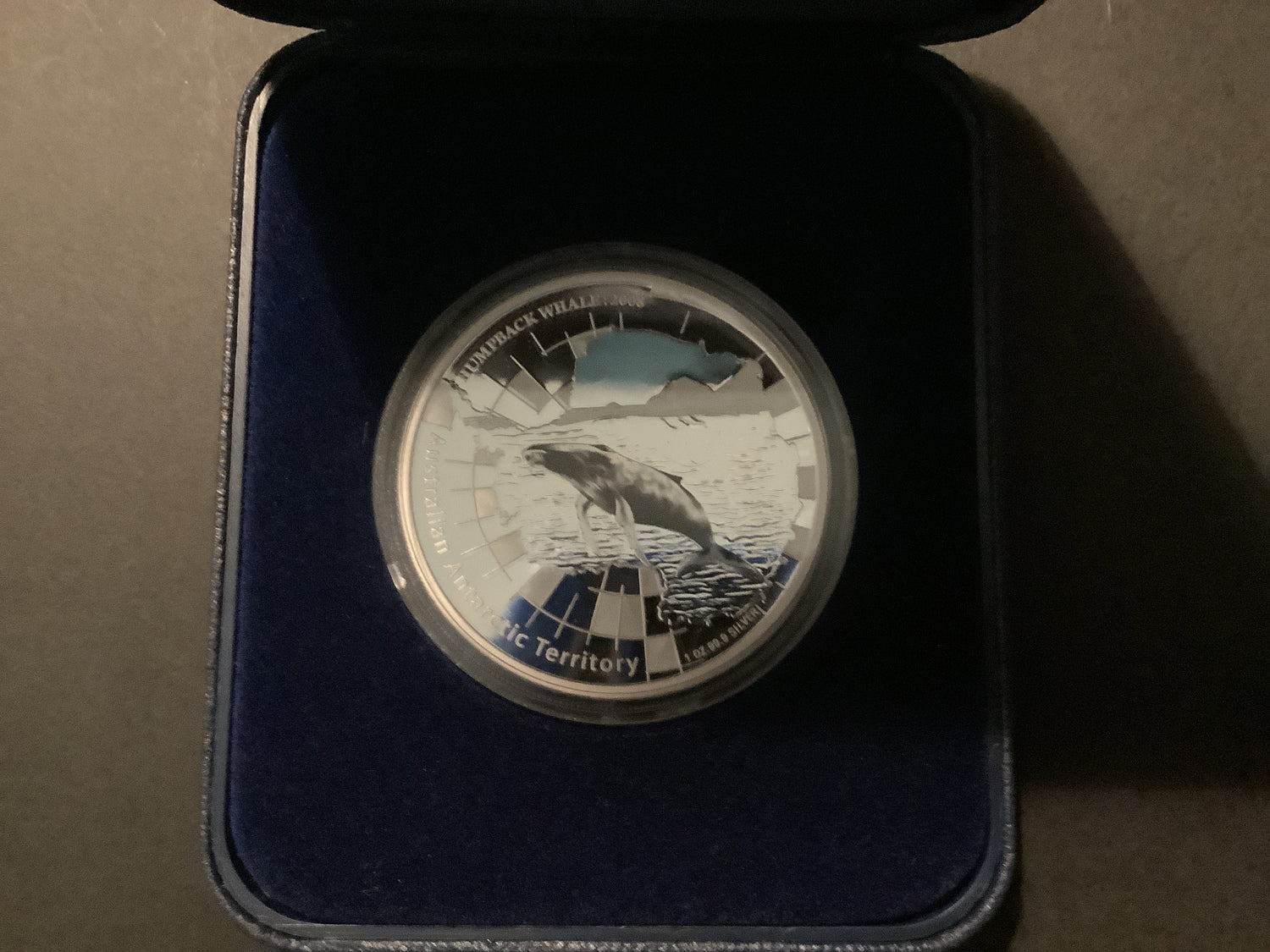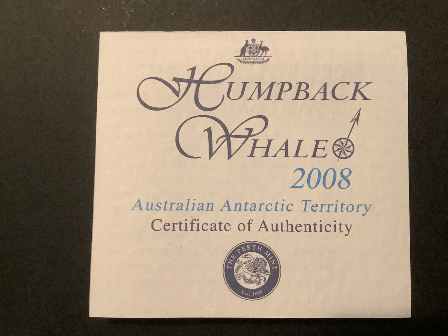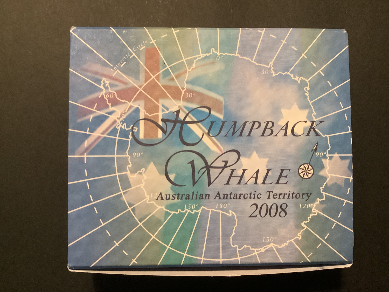 2008 $1 Australian Antarctic Territory 1oz Silver Coin. Humpback Whale.