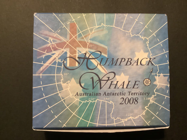 The 2008 $1 Australian Antarctic Territory 1oz Silver Coin celebrates the majestic Humpback Whale.