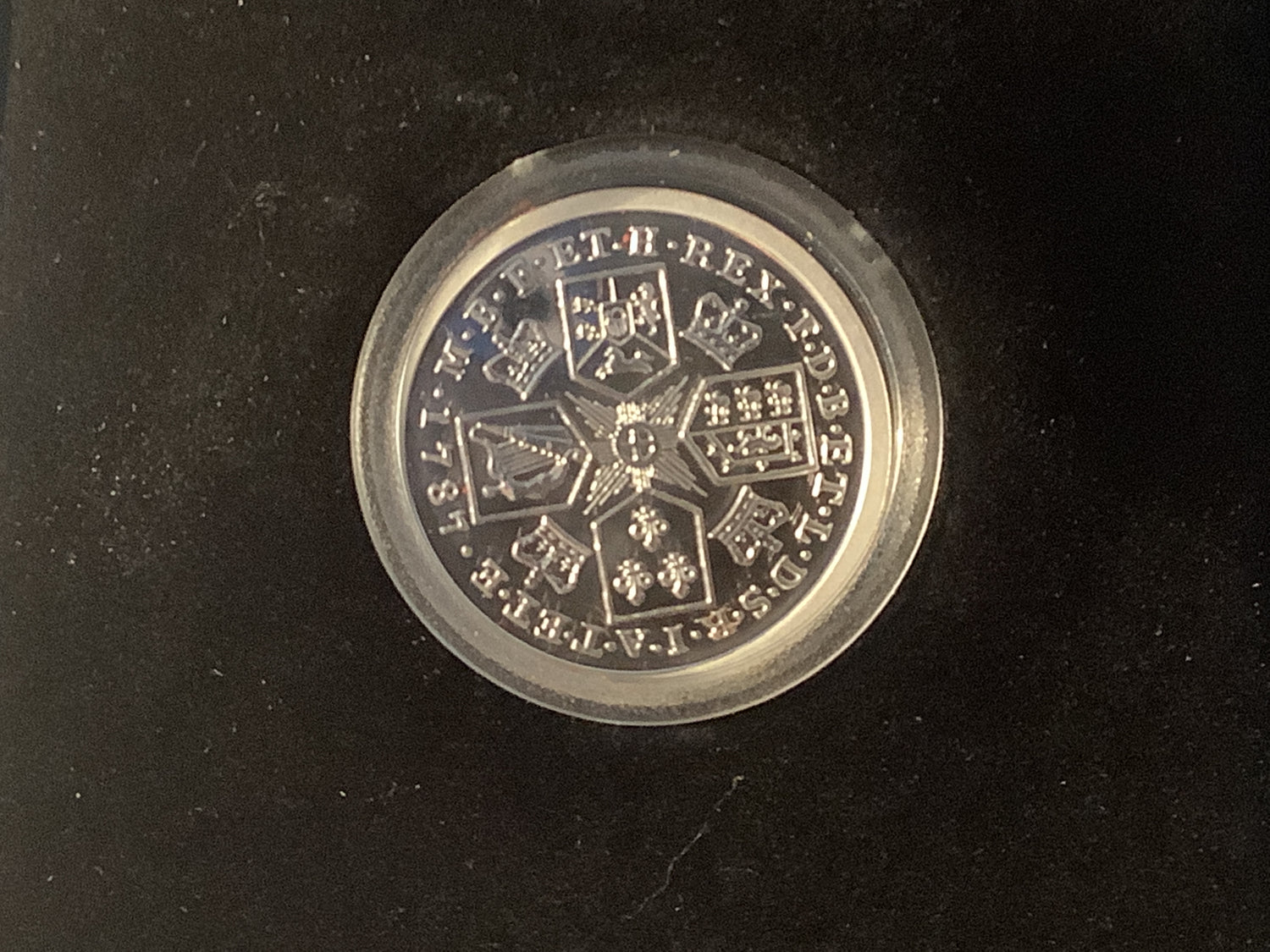 The reverse side showcases an intricate design of the original 1787 Shilling, while the obverse features the effigy of Queen Elizabeth II.
