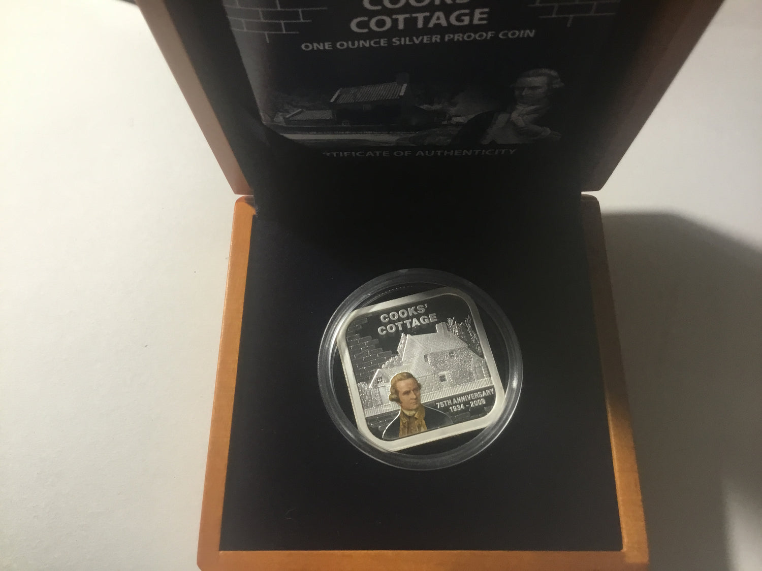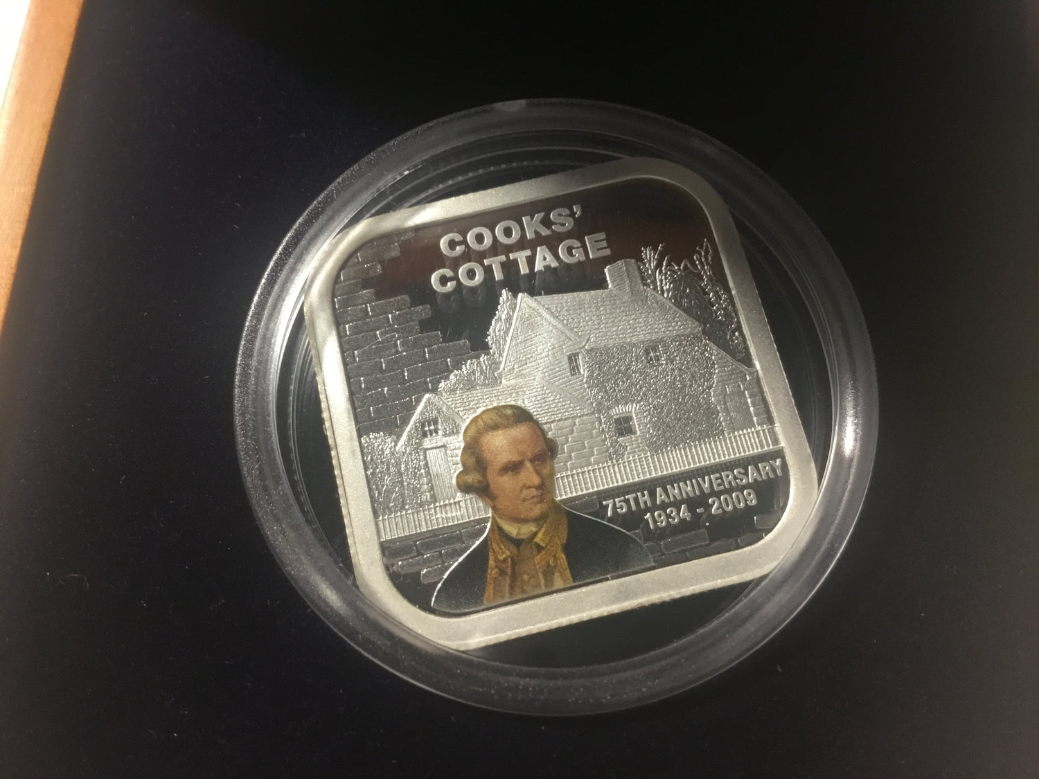 Struck from one ounce of fine silver, this coin features a detailed portrayal of Cooks' Cottage, the childhood home of Captain James Cook, against a backdrop that captures its enduring charm and historical significance.