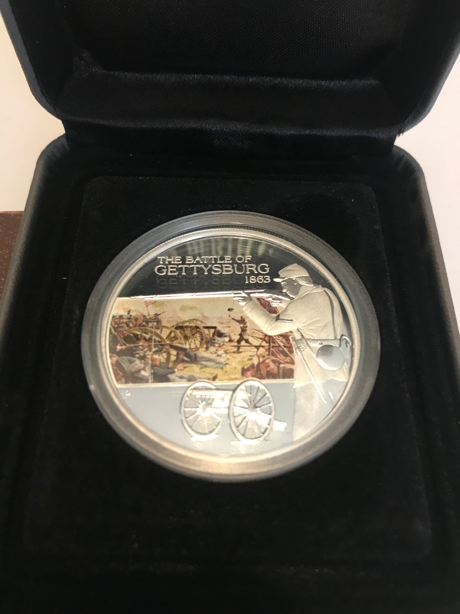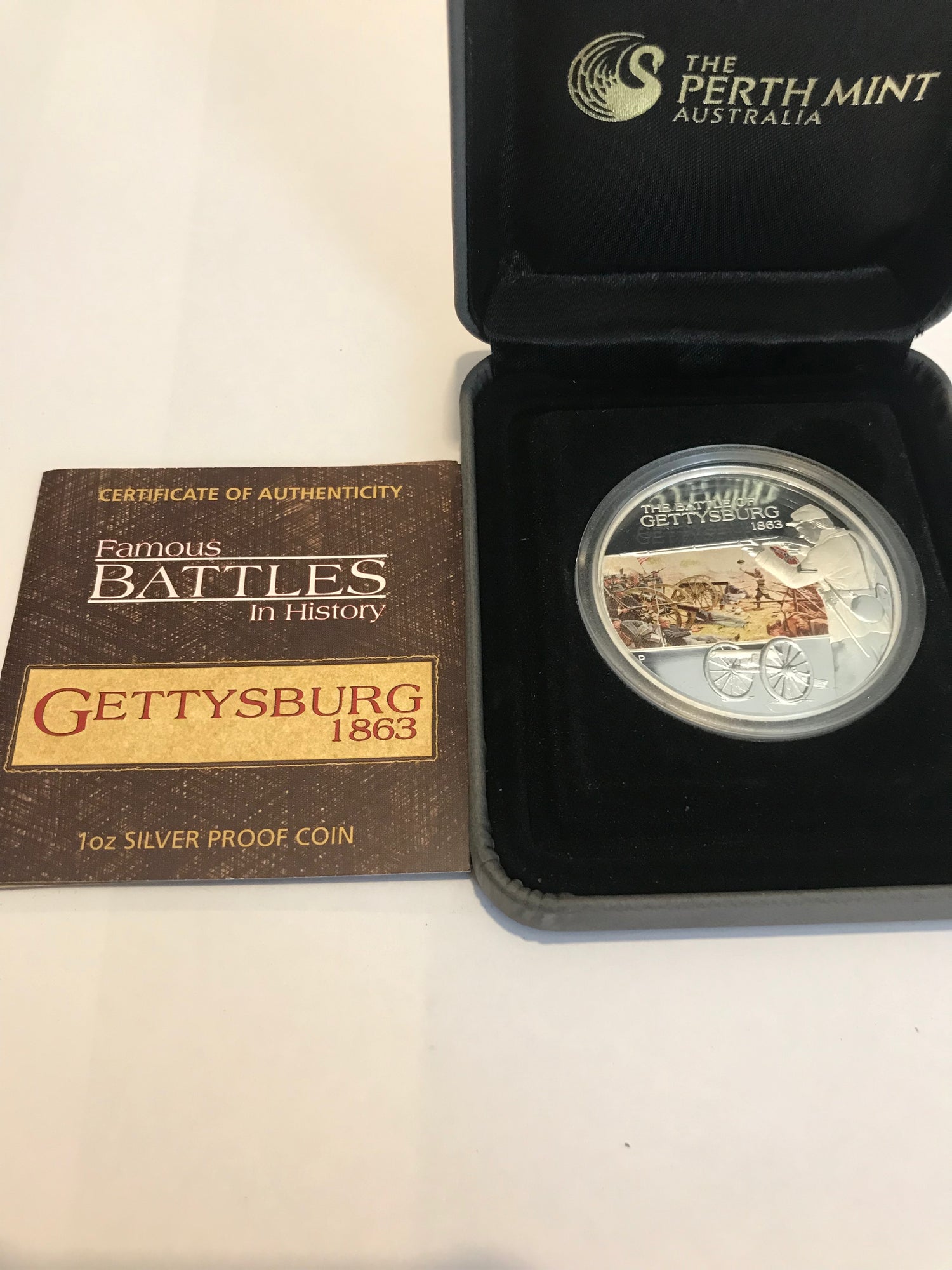 2009 $1 Famous Battles in History. Gettysburg. 1 Ounce Silver Proof Coin is backordered and will ship as soon as it is back in stock.