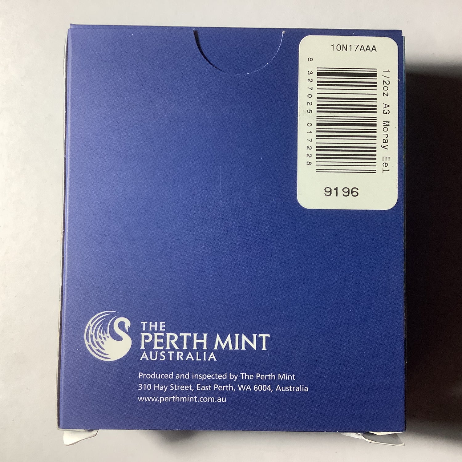 Released by the Perth Mint, this 1/2-ounce silver coin celebrates the Moray Eel.