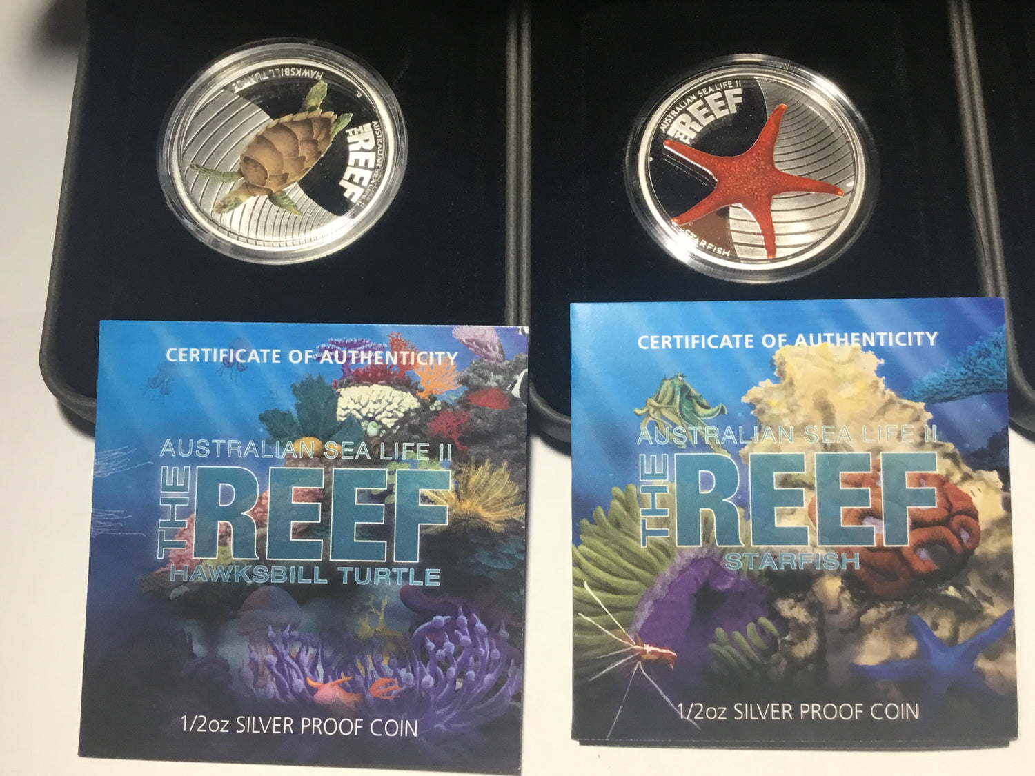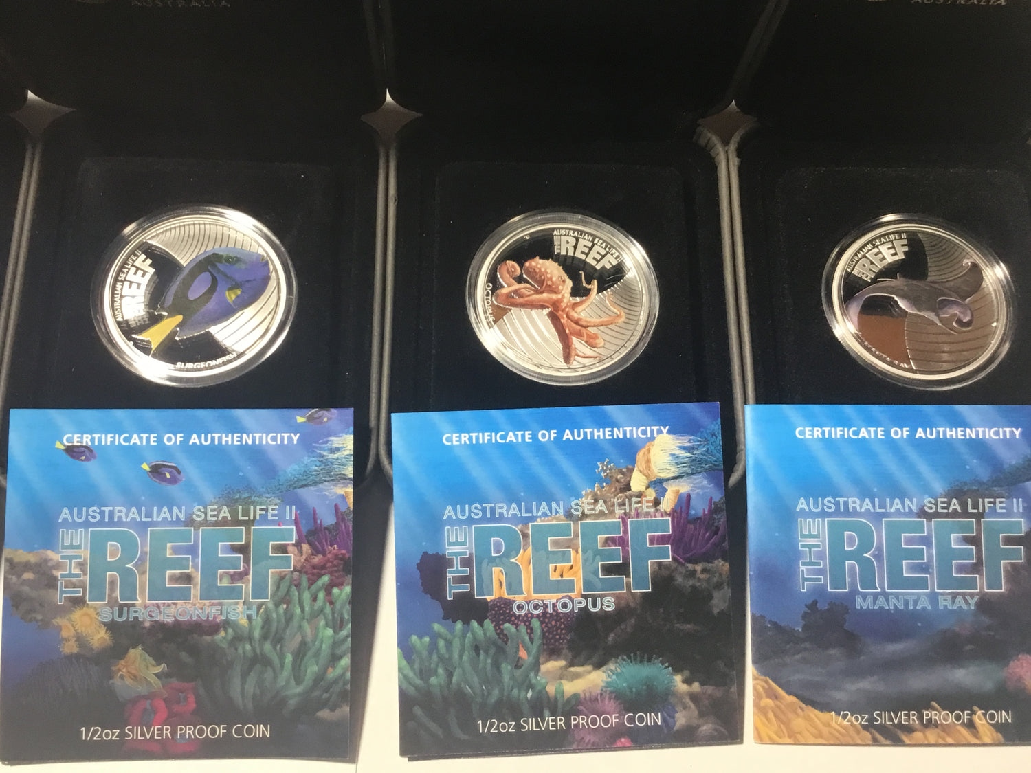 Released between 2011 and 2012 this 5 coin 1/2oz silver set celebrates the animals that inhabit the Australian Reef. The set features the following coins in proof condition
