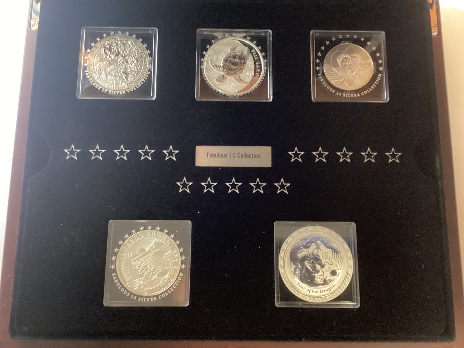 Released in 2012, this 15-coin set contains silver coins from around the world. Each coin contains 1oz of silver and is presented in a wooden case featuring three levels of coins. Each coin comes with a certificate of authenticity.