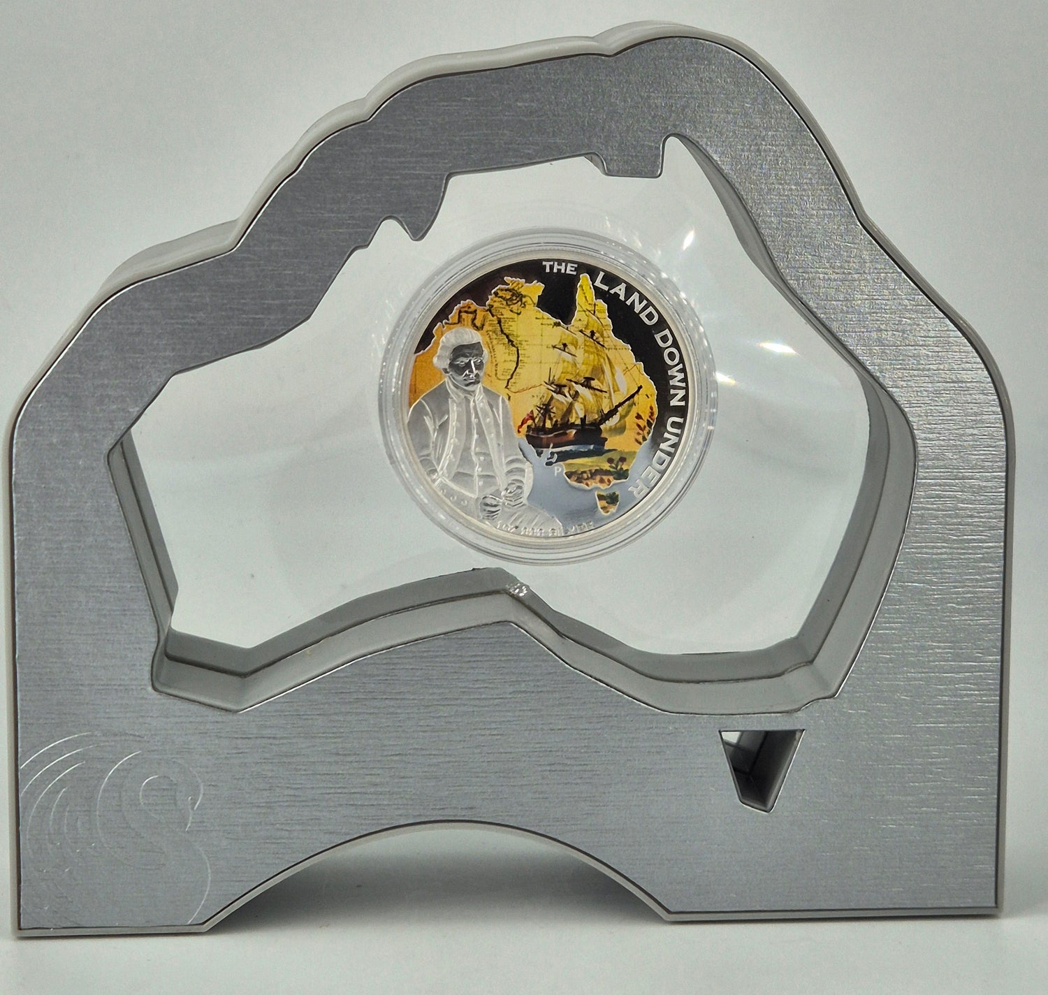 This 2013 1oz silver proof coin from the Perth Mint features a coloured depiction of early European exploration in Australia. Part of The Land Down Under series, it honors the nation's historical roots.