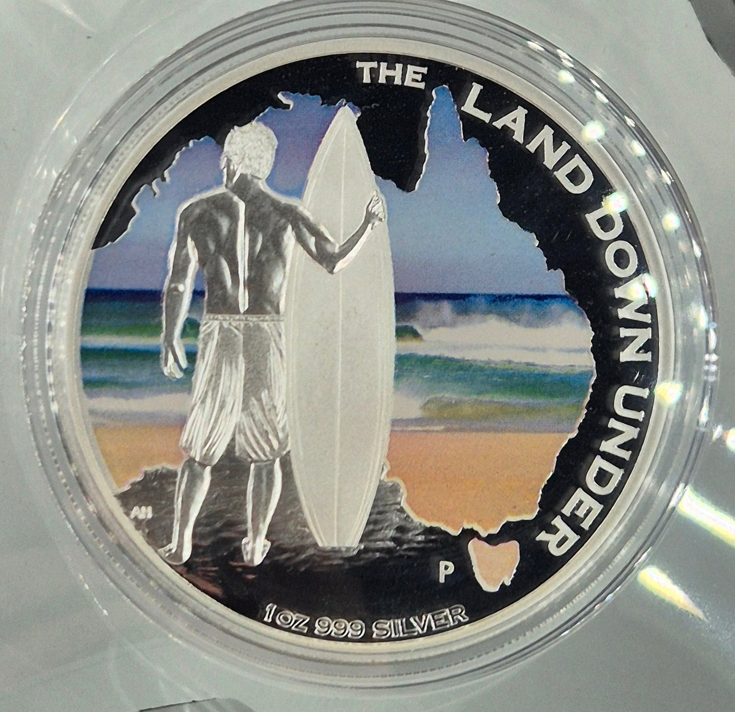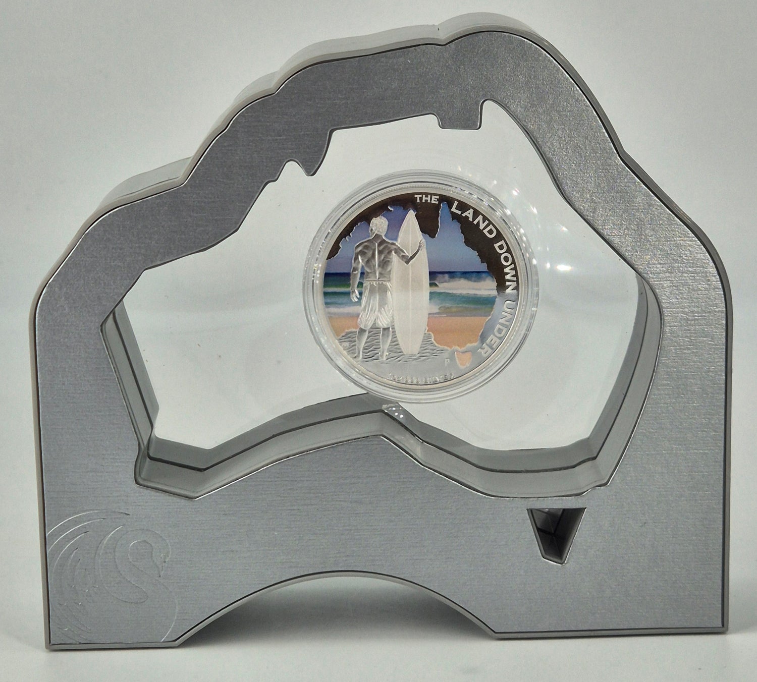 This 2013 1oz silver proof coin from the Perth Mint features a coloured depiction of surfing, capturing Australia's iconic beach lifestyle. Part of The Land Down Under series celebrating Aussie culture and identity.