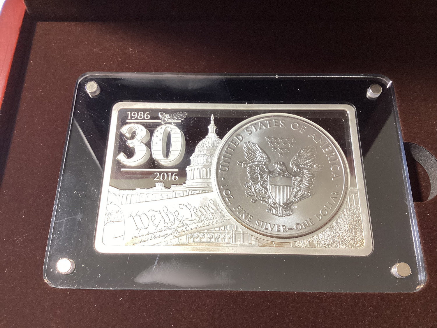 2016 30th Anniversary of the Silver Eagle Coin. Most Famous Bullion Coin Bar Series. 2oz Silver Bar with 1oz Silver Coin.
