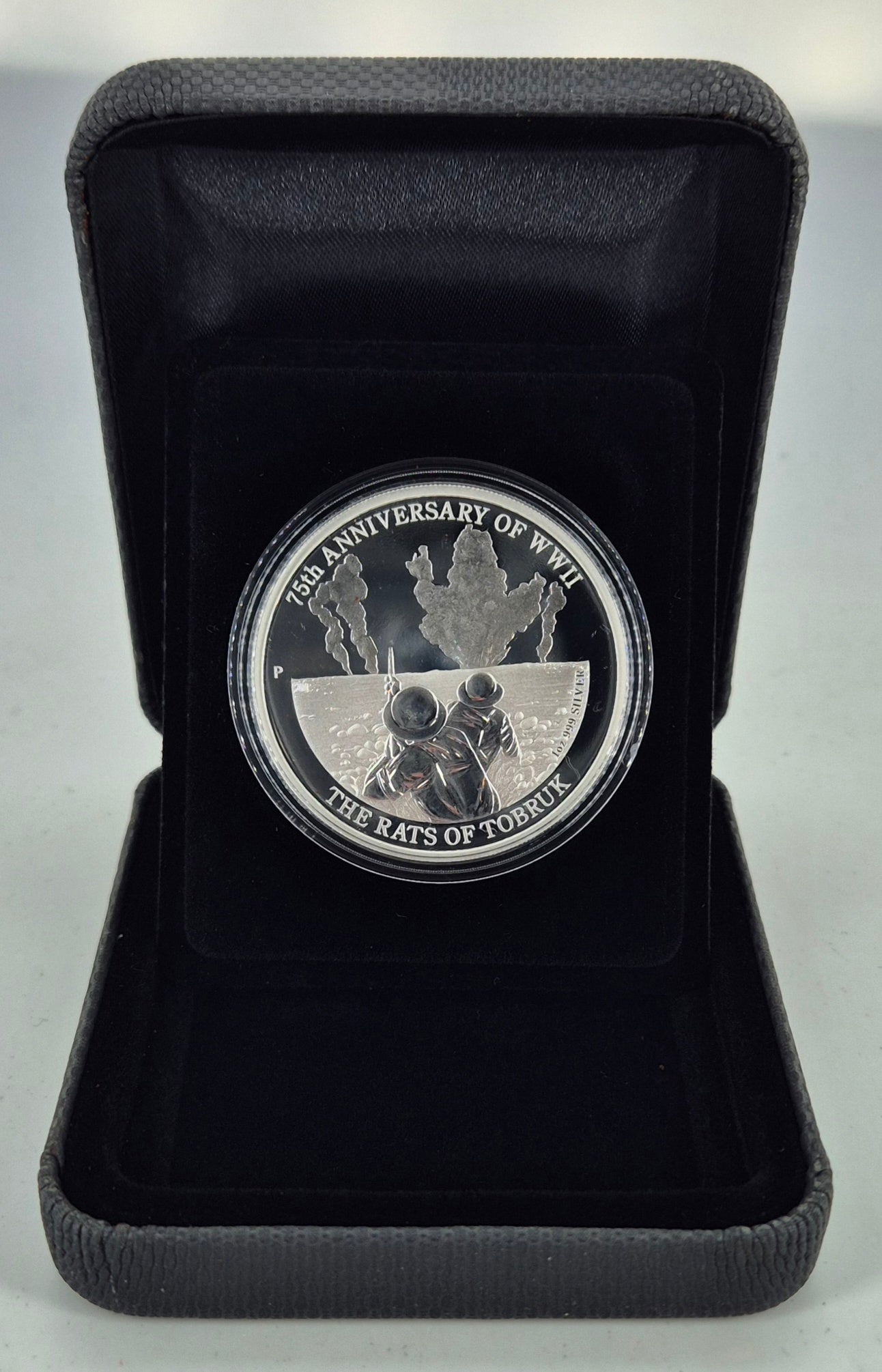Struck from 1 troy ounce of 99.9% pure silver, the coin’s reverse features a rugged depiction of a determined Australian soldier standing against desert fortifications, with barbed wire and the inscription “THE RATS OF TOBRUK 1941 – 2016”. A stylised Union Jack and Rising Sun badge add symbolic weight to the design.