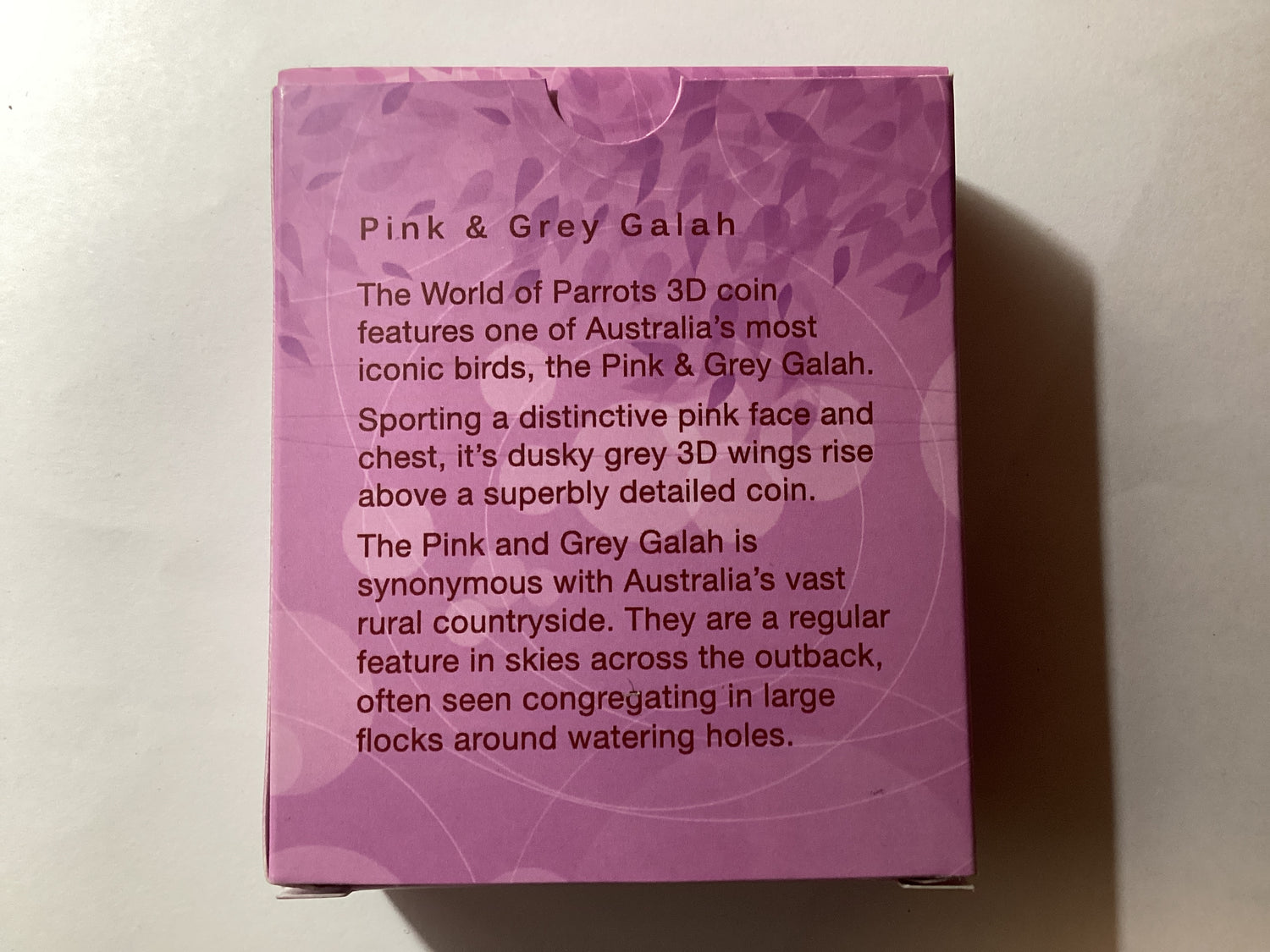 The coloured proof finish showcases the Pink and Grey Galah in stunning detail, capturing its distinctive pink and grey plumage and charismatic presence.