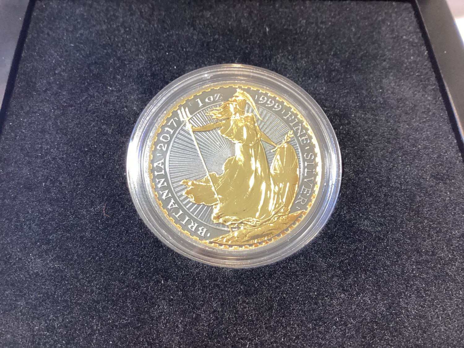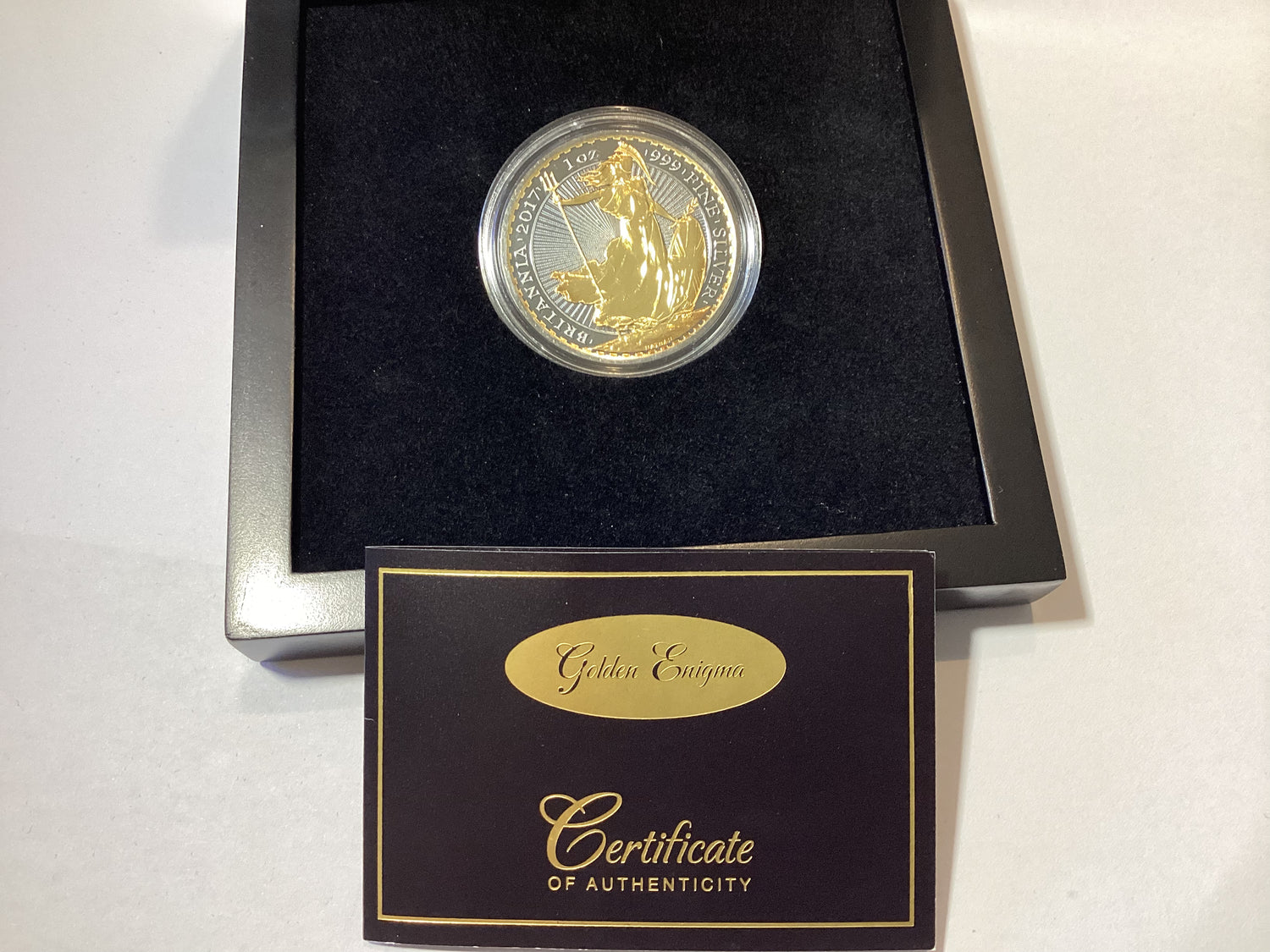 2017 2 Pound. Britannia Gold Enigma Premium Edition. 1oz Silver Proof Gilded Coin.