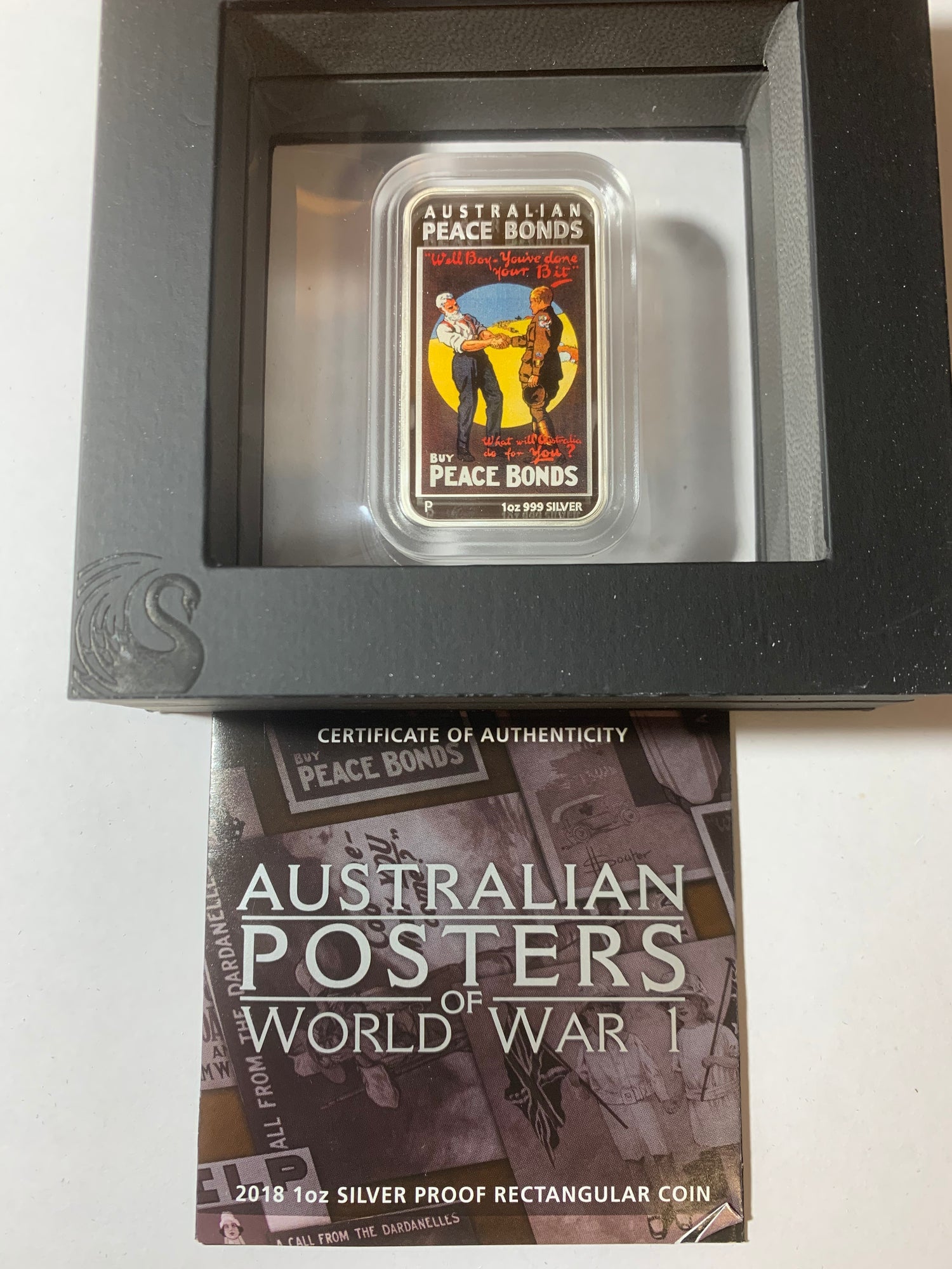 2018 $1 1oz Silver Proof Rectangular Coin. Australian Posters of World War 1. Australian Peace Bonds. is backordered and will ship as soon as it is back in stock.