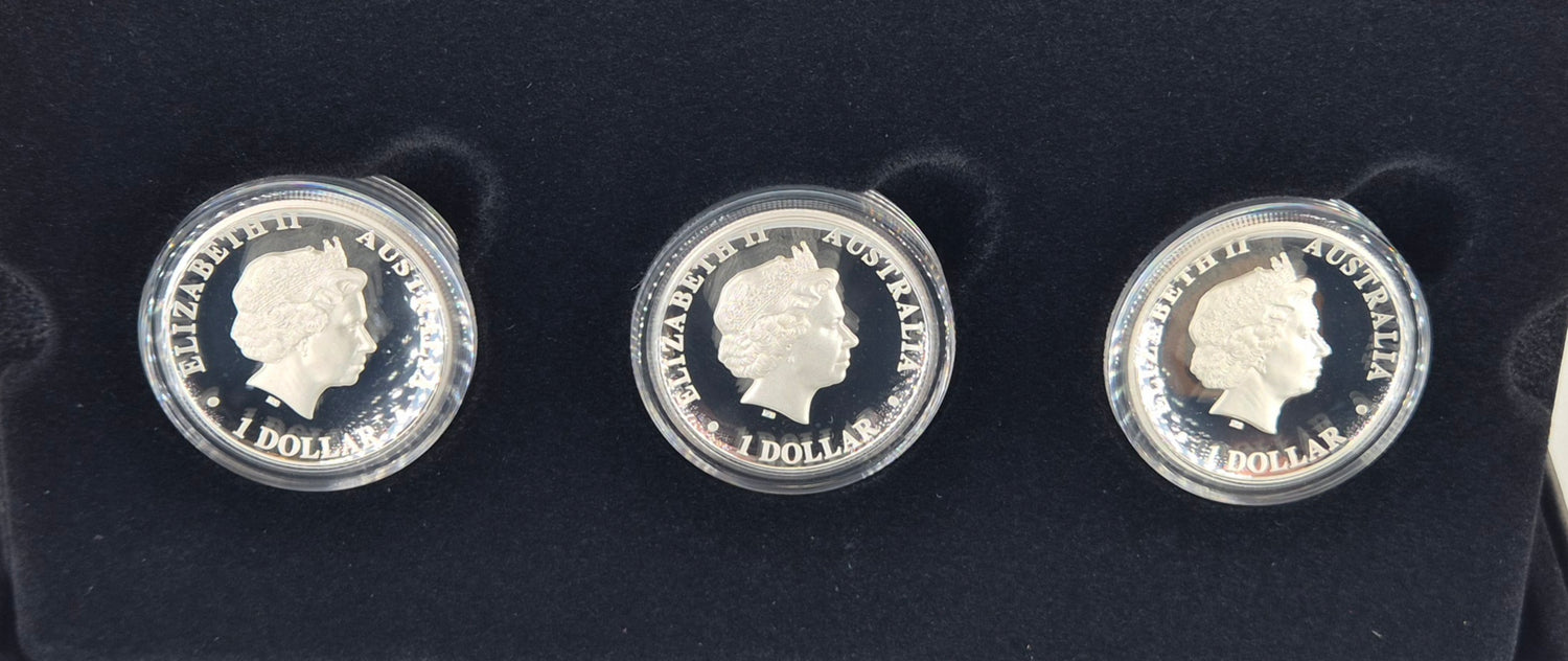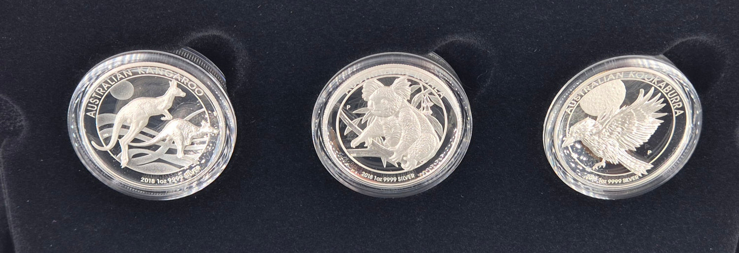 Struck by The Perth Mint in 2018, this premium three-coin set includes 1oz silver proof versions of the iconic Kangaroo, Koala, and Kookaburra in high relief. Housed in a deluxe presentation case with a numbered certificate of authenticity.