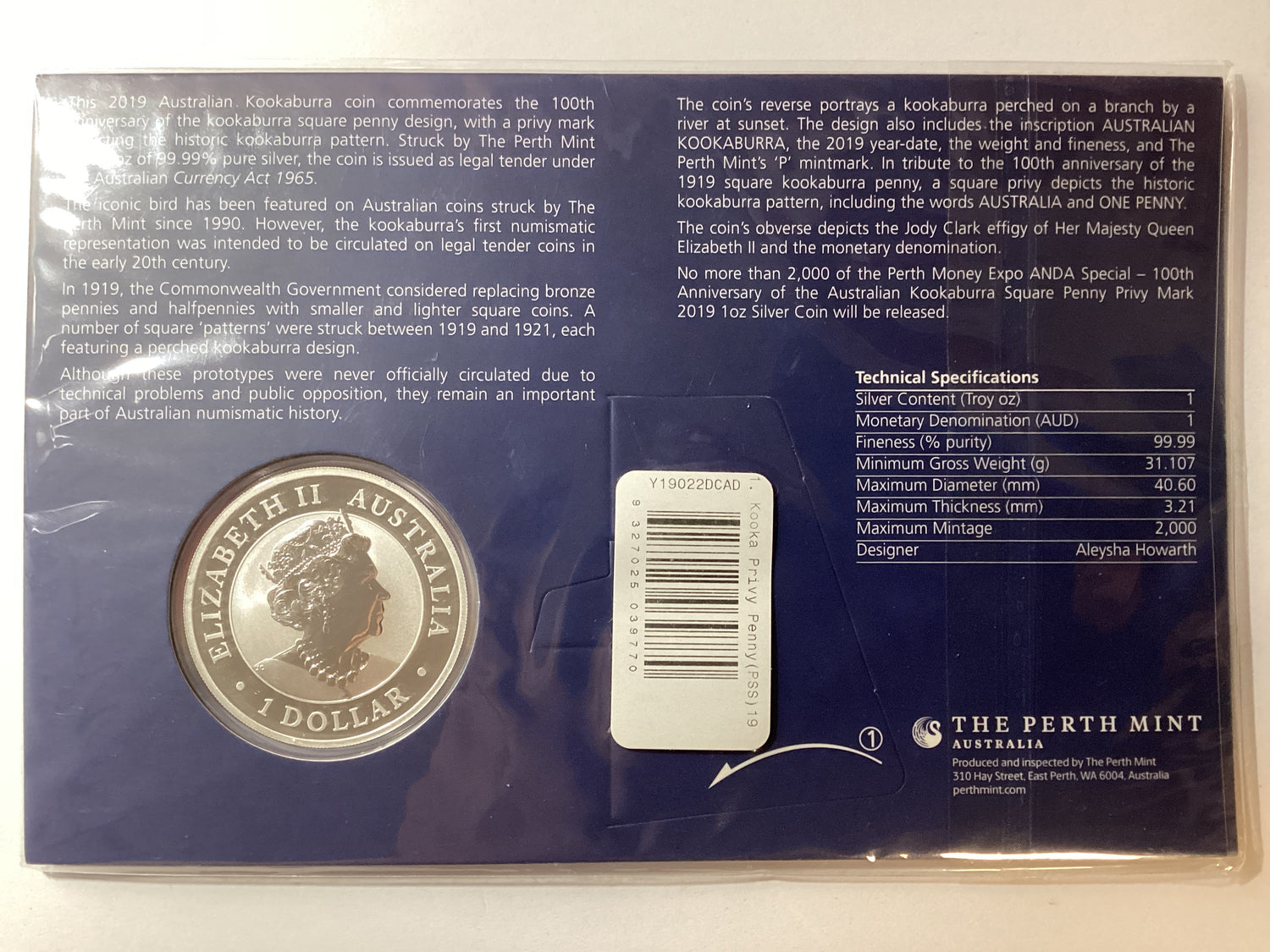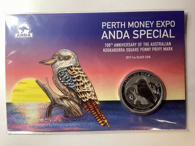 2019 $1 1oz Silver Kookaburra. ANDA Perth. 100th Anniversary of Australian Square Kookaburra Privy Mark.