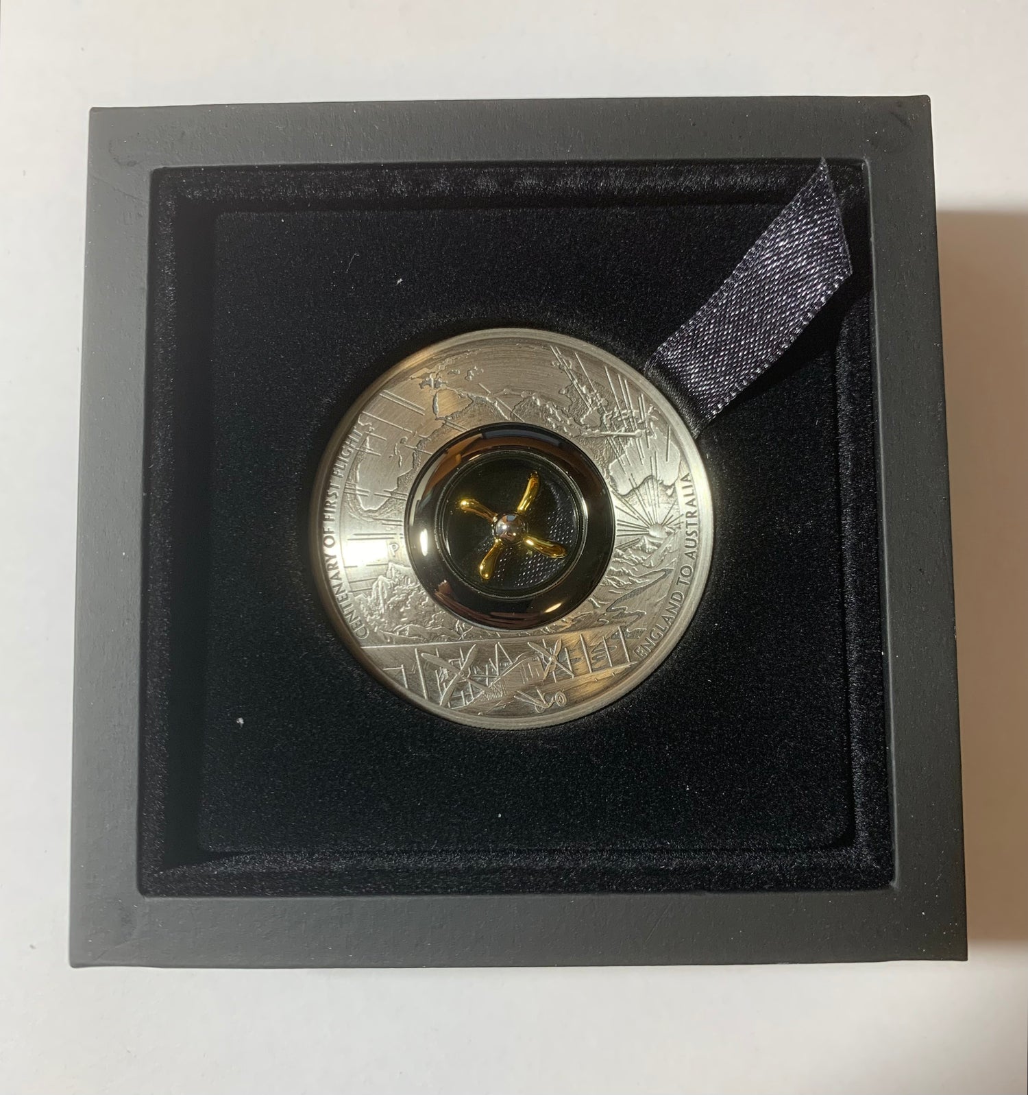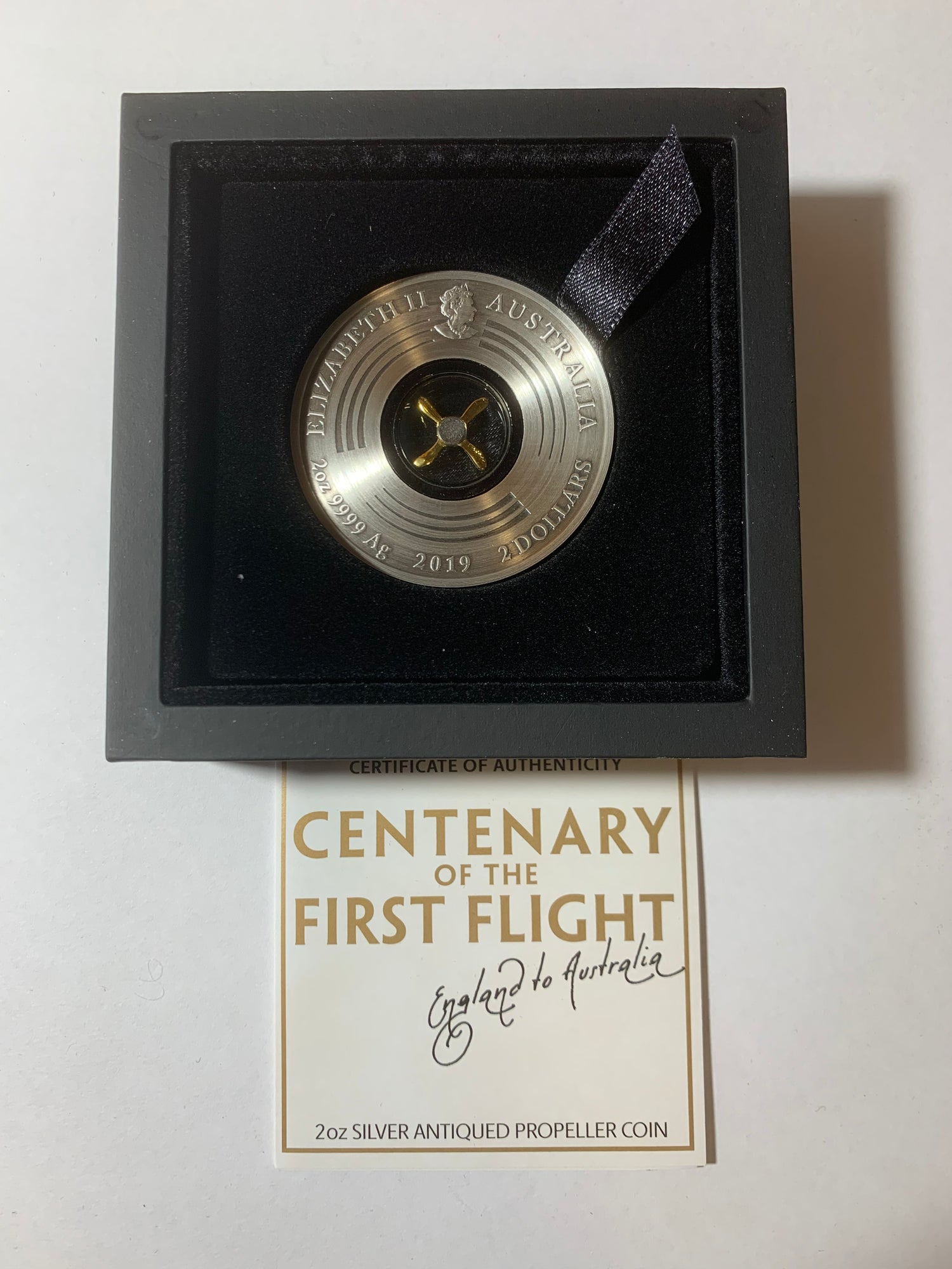 2019 $2 2oz Silver Proof Coin. Centenary of Flight. England to Australia. Antiqued Propeller Coin.