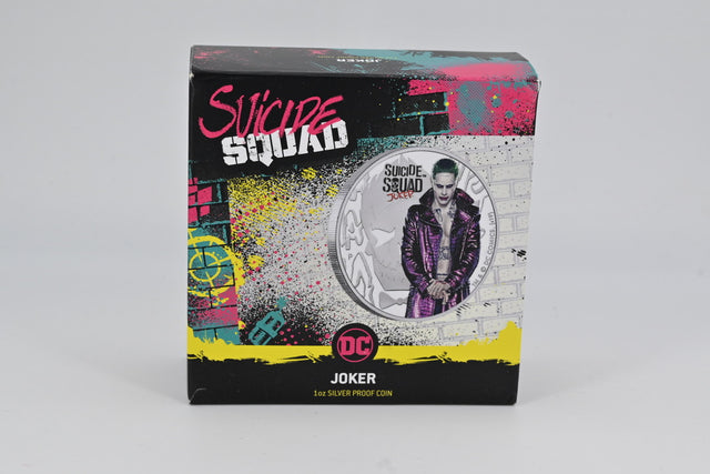 1oz silver proof featuring the Joker from Suicide Squad, with vibrant color and bold comic styling.