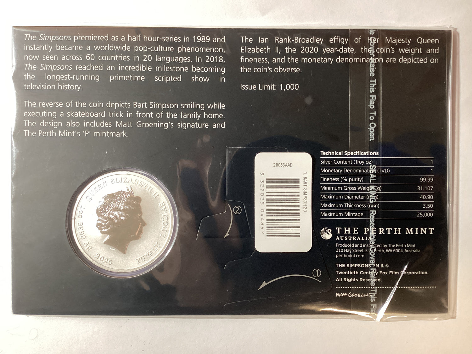 2020 $1 1oz Silver Carded Coin. The Simpsons. Bart Simpson. is backordered and will ship as soon as it is back in stock.