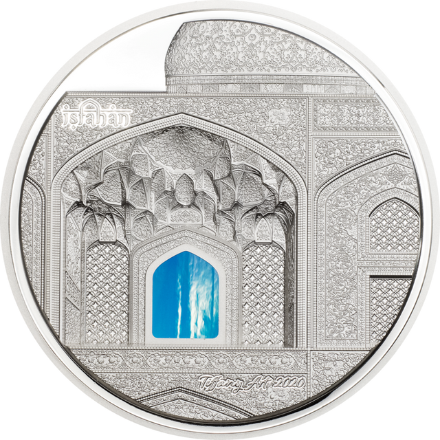 Product Description: A masterpiece from the Tiffany Art series, this 3oz silver proof coin highlights the stunning architectural beauty of Isfahan, incorporating exquisite stained-glass elements.