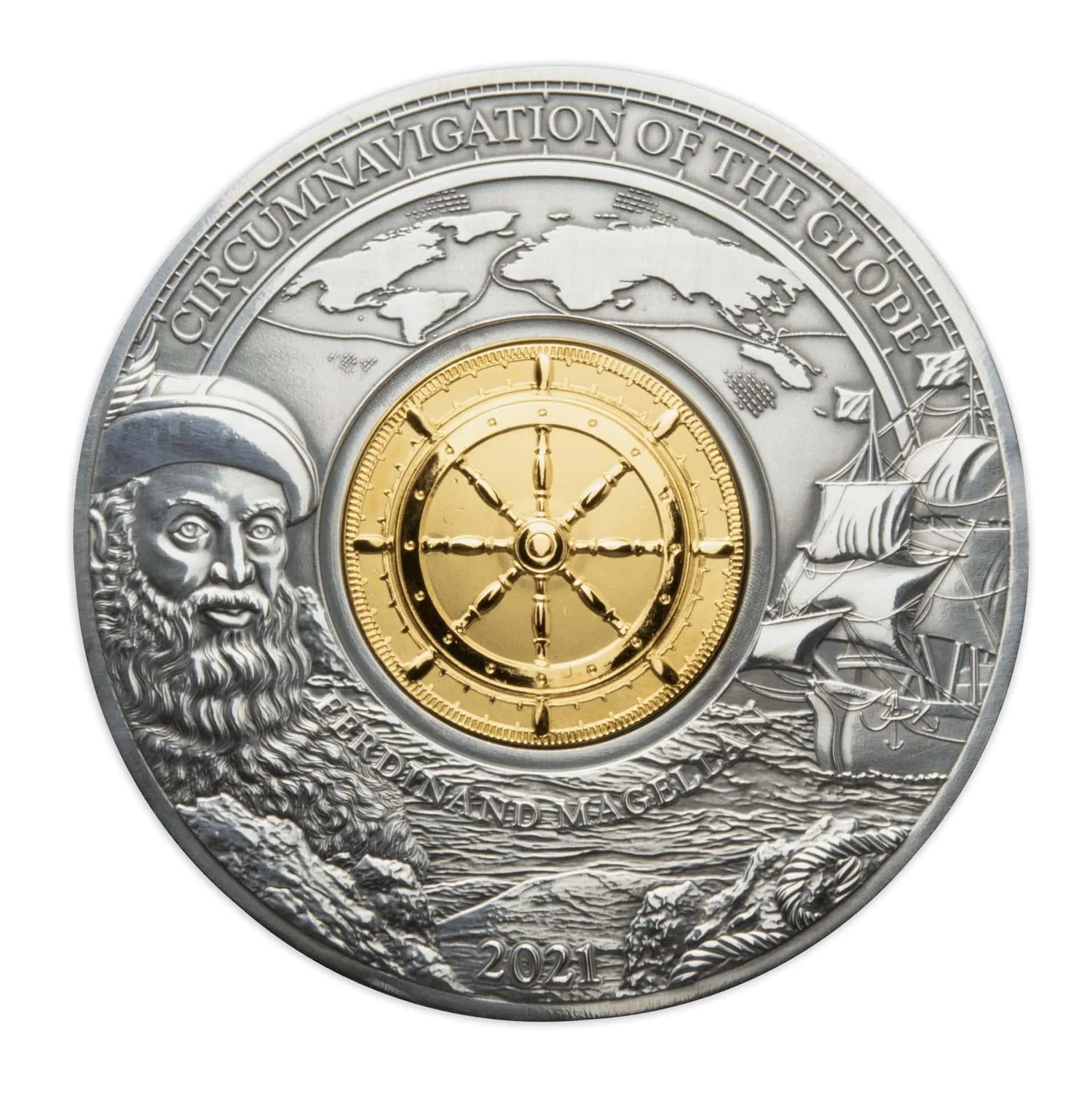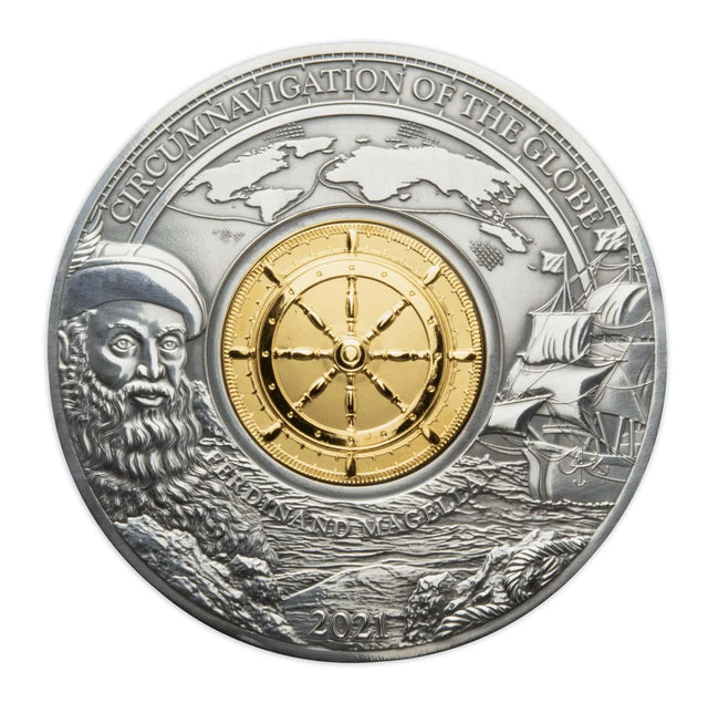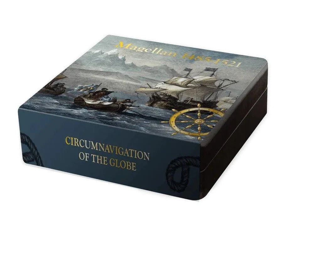 Product Description: This 3oz silver proof coin honors the 500th anniversary of Ferdinand Magellan’s voyage, featuring an intricate design of his historic expedition. The obverse features the Barbados coat of arms.
