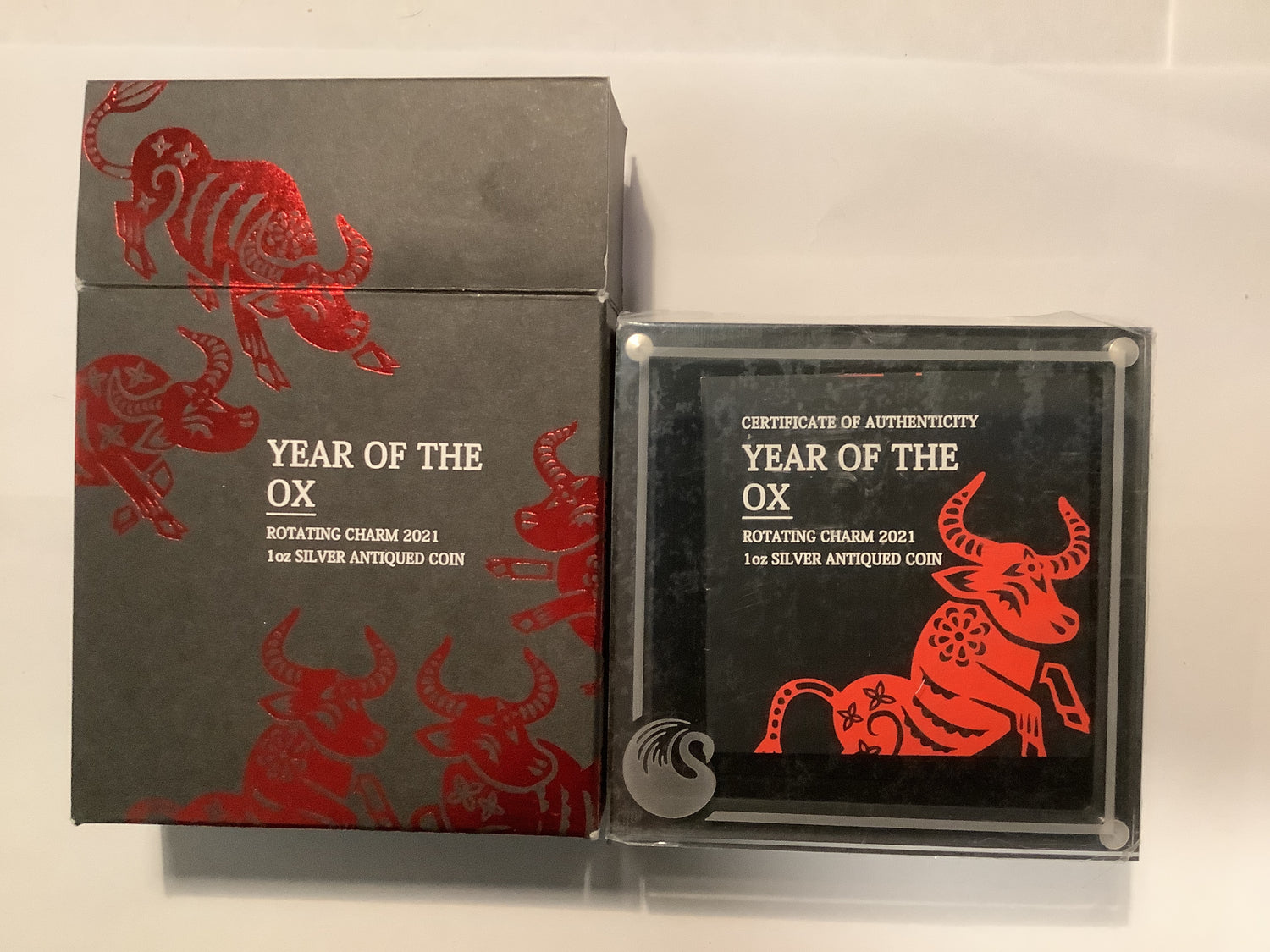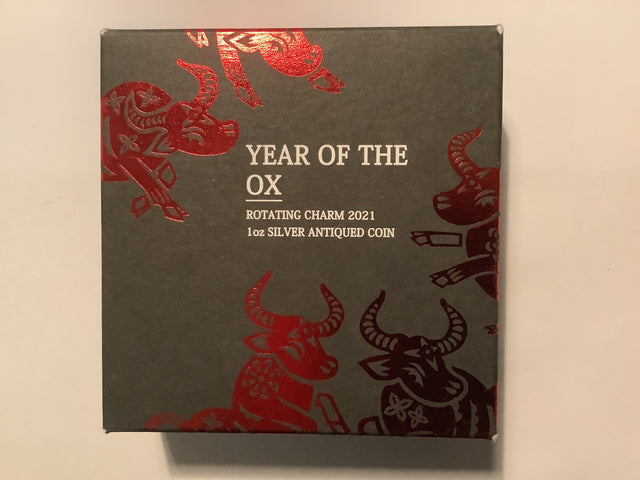 2021 Year of the Ox Rotating Charm. 1oz Silver Antiqued Coin. is backordered and will ship as soon as it is back in stock.