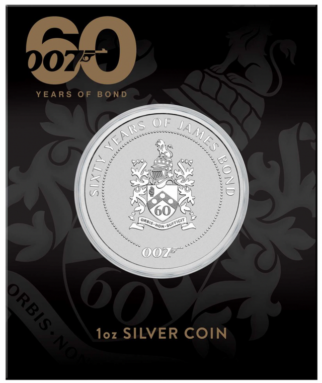 An exciting release for fans celebrating ‘60 Years of Bond’, this official 1oz silver coin is emblazoned with the Bond family crest. Limited to 1,000 minted in carded form.