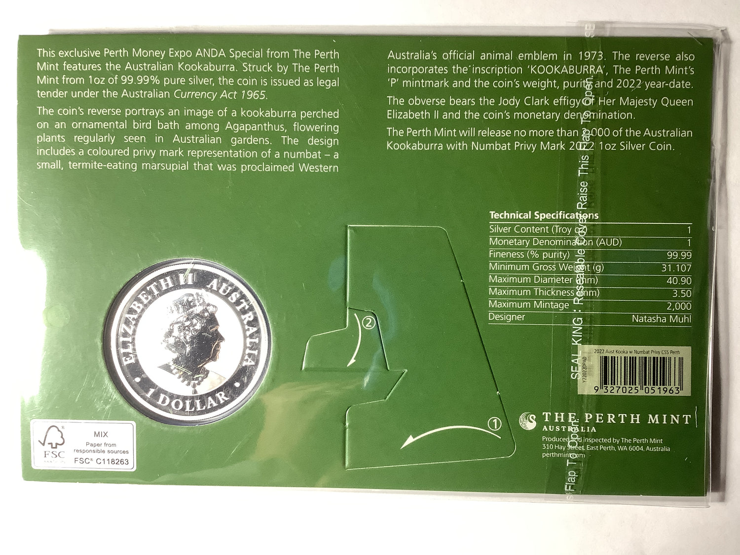 2022 ANDA Perth. Australian Kookaburra with Numbat Privy Mark 1 ounce Silver.
