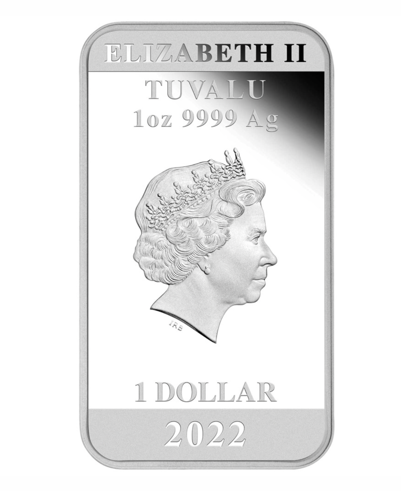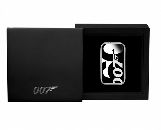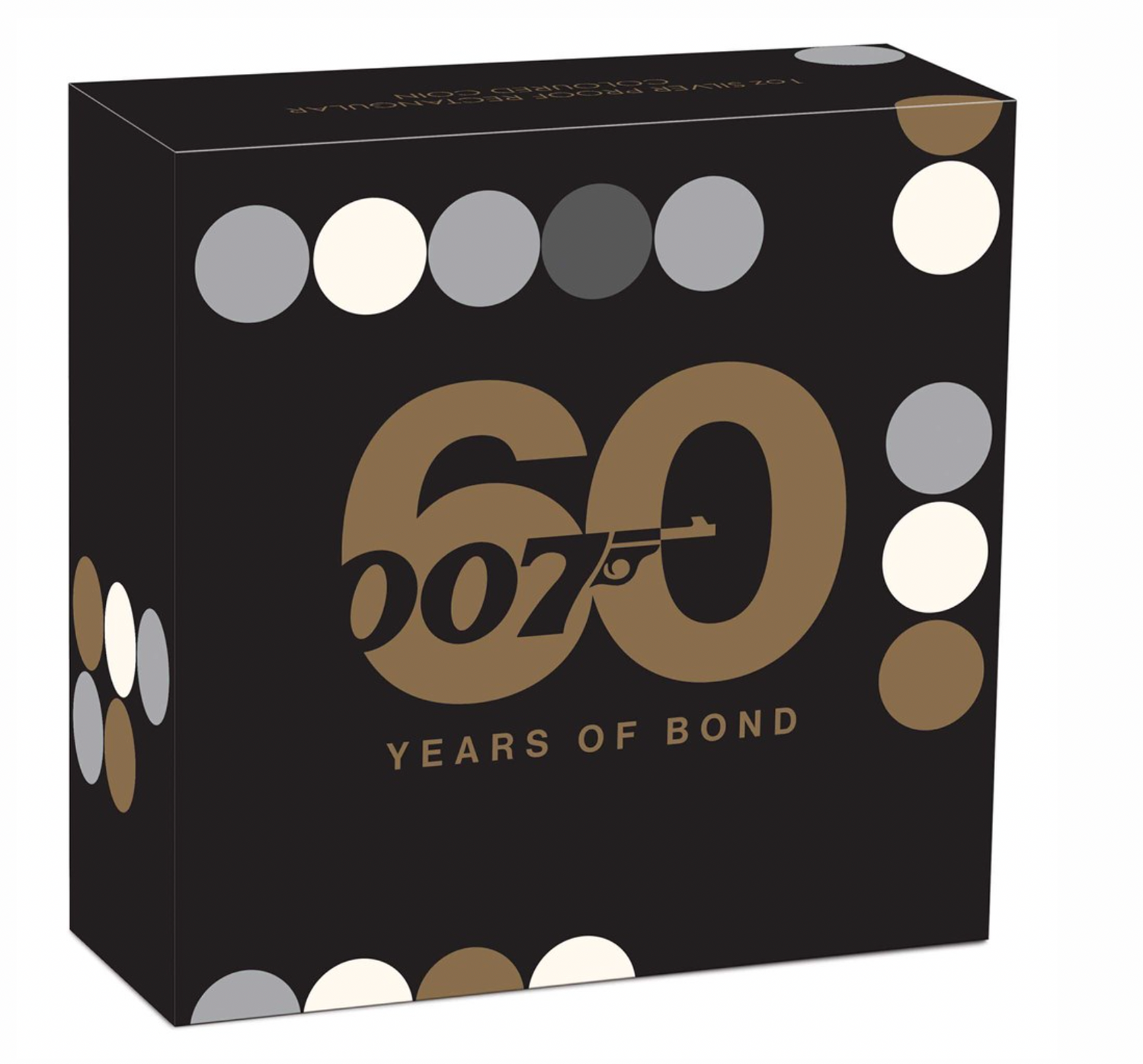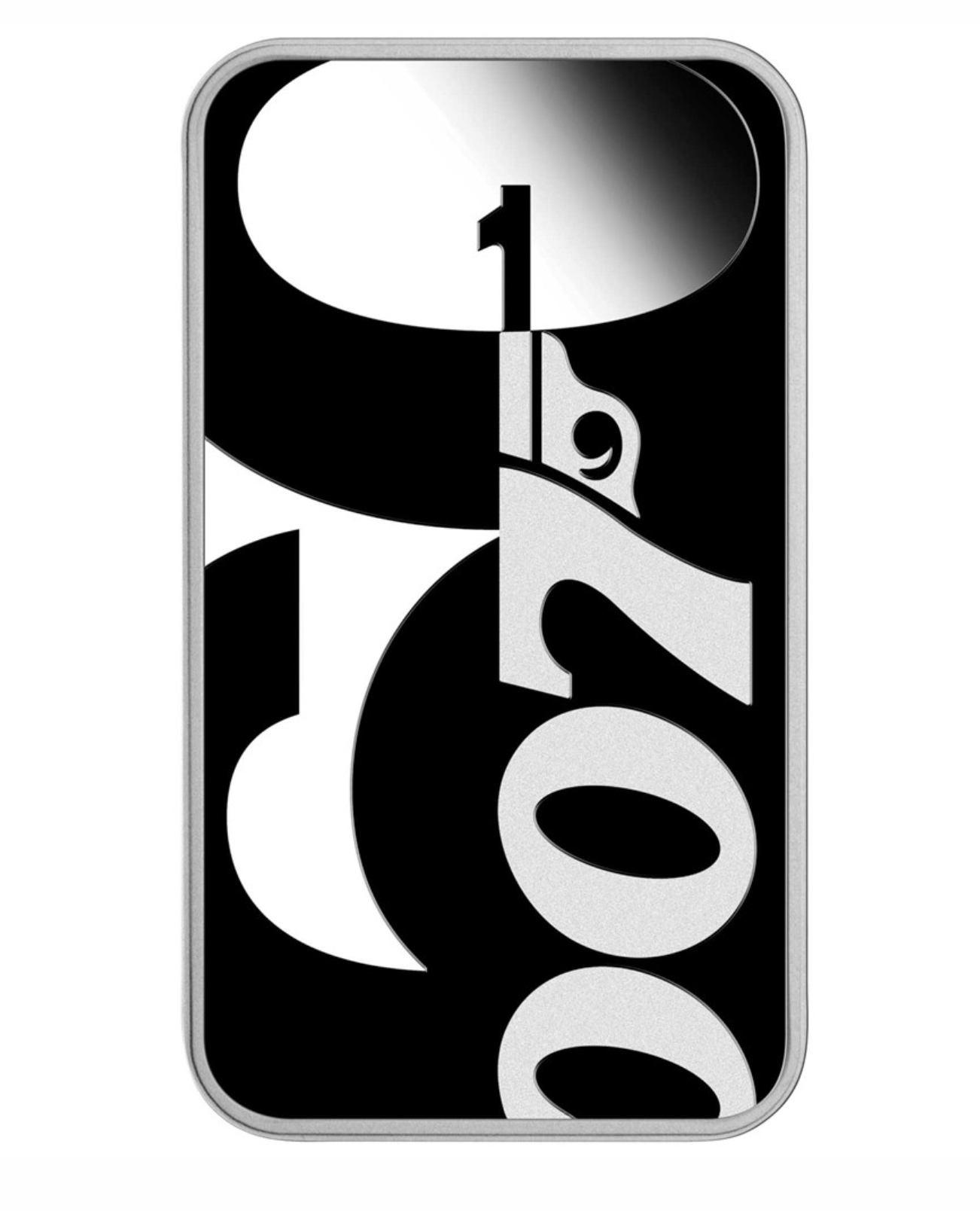 Struck from 1oz of 99.99% pure silver in proof quality, this rectangular-shaped coin celebrates 60 Years of Bond, the legendary British spy featured in 25 blockbuster movies released by EON Productions since 1962.