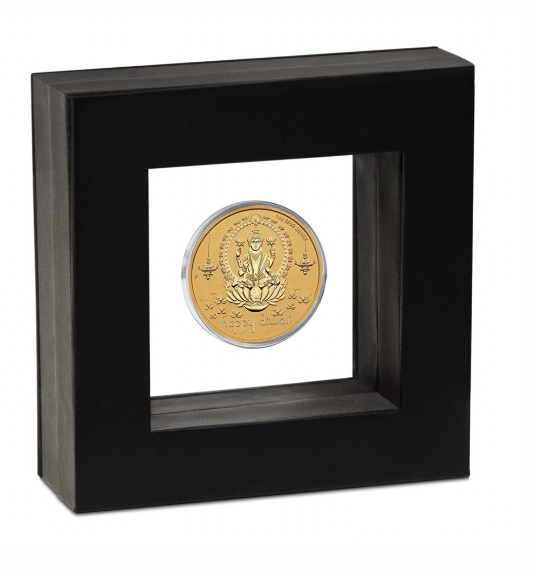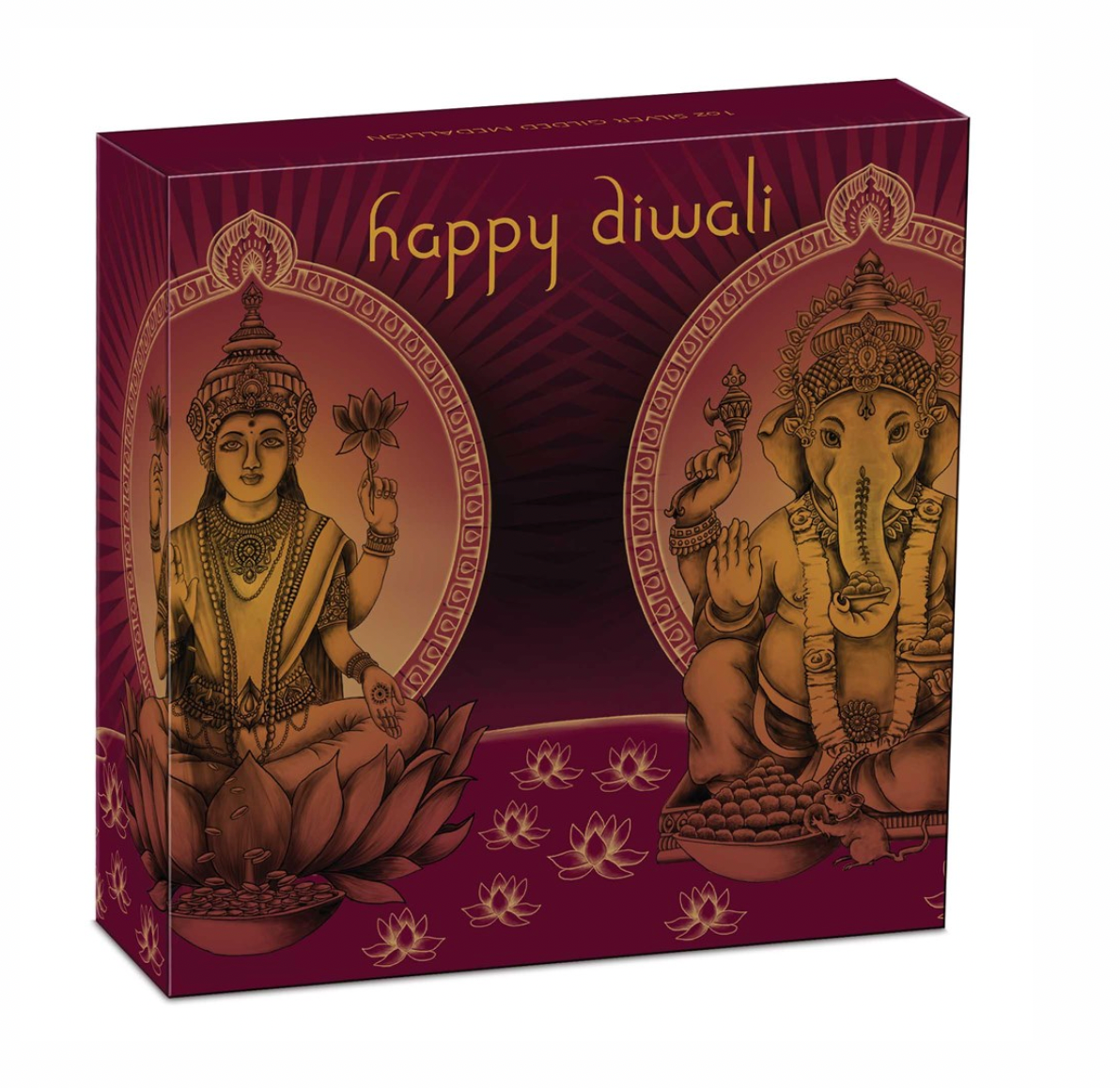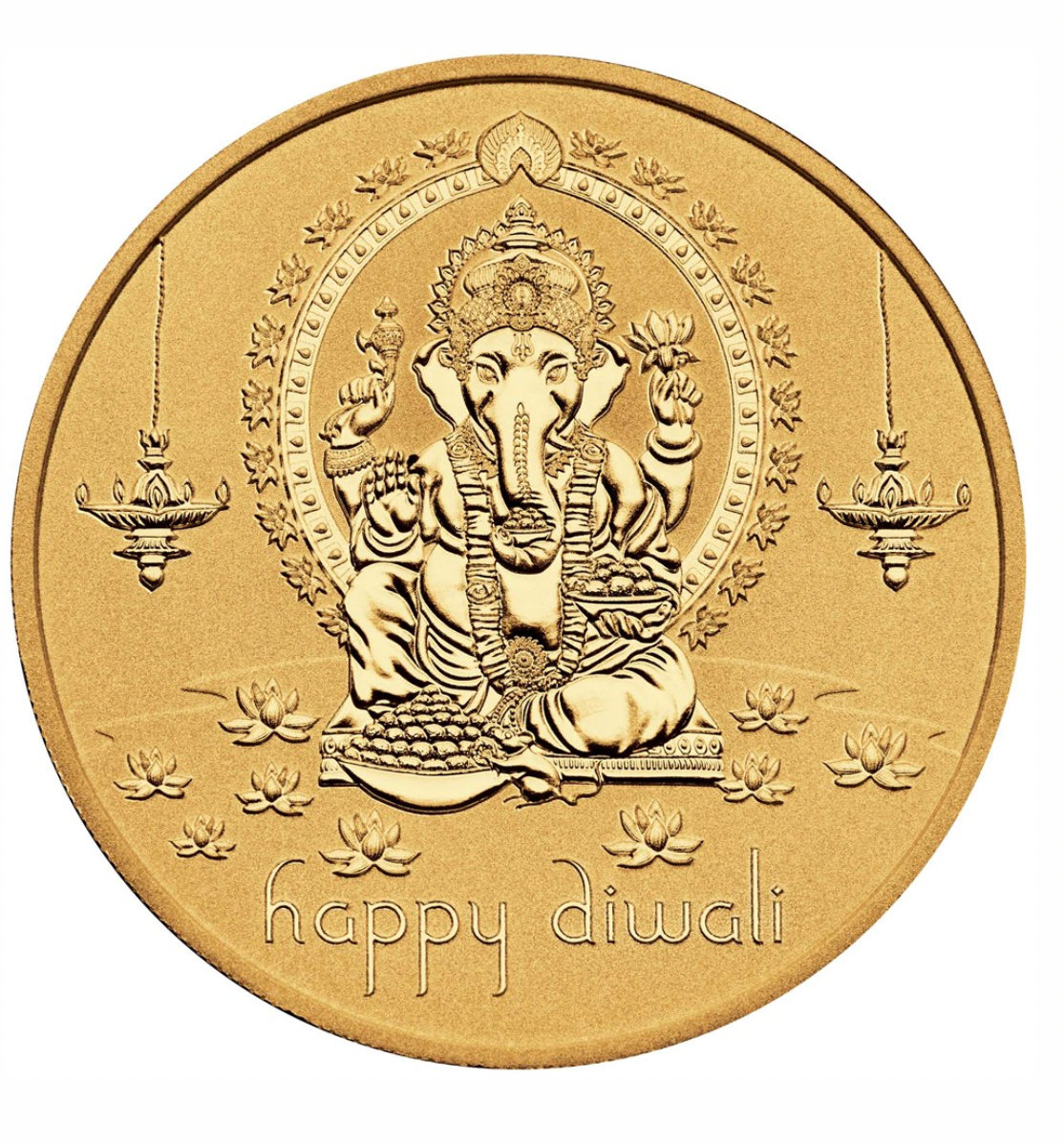 Heighten the joy of your family’s Diwali celebration with this delightful 1oz silver medallion featuring 24-carat gilding on the edge and rim.