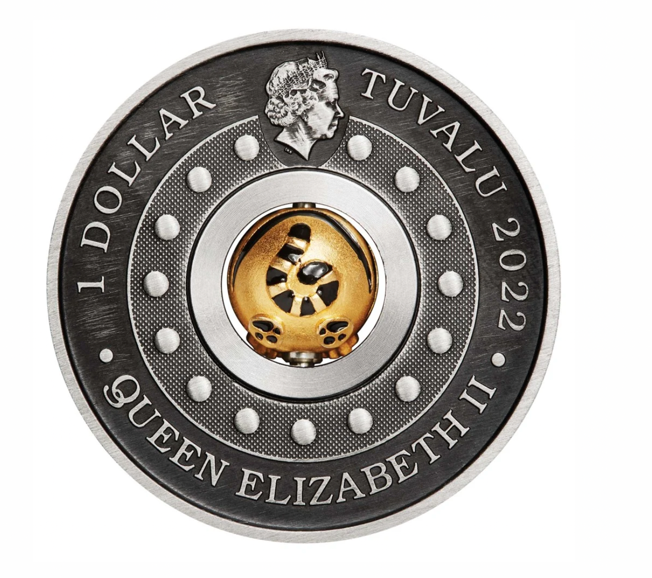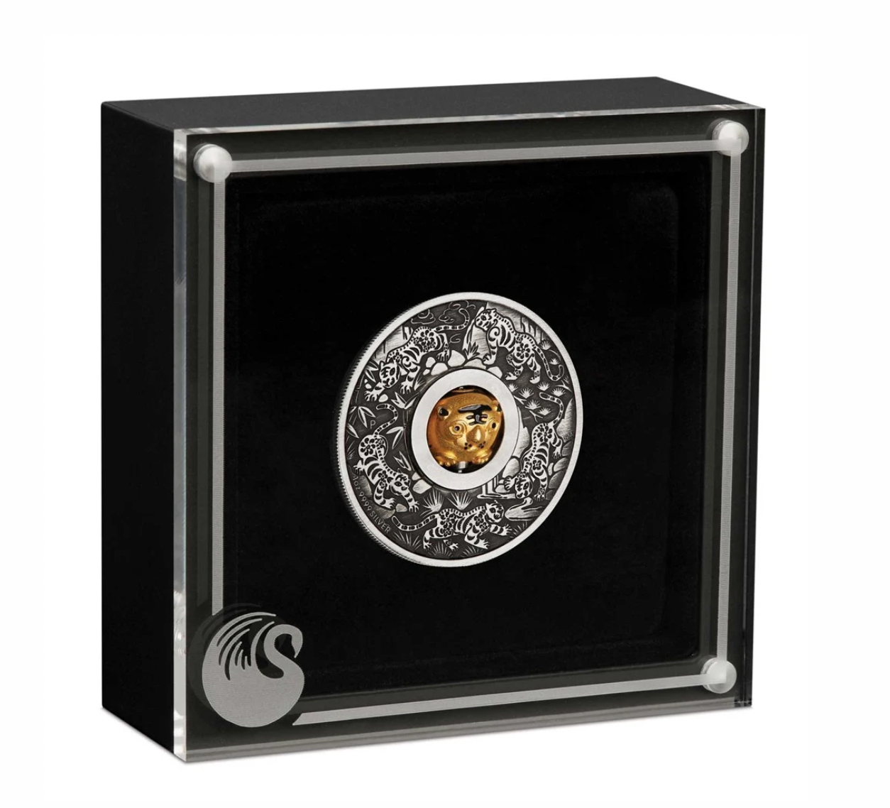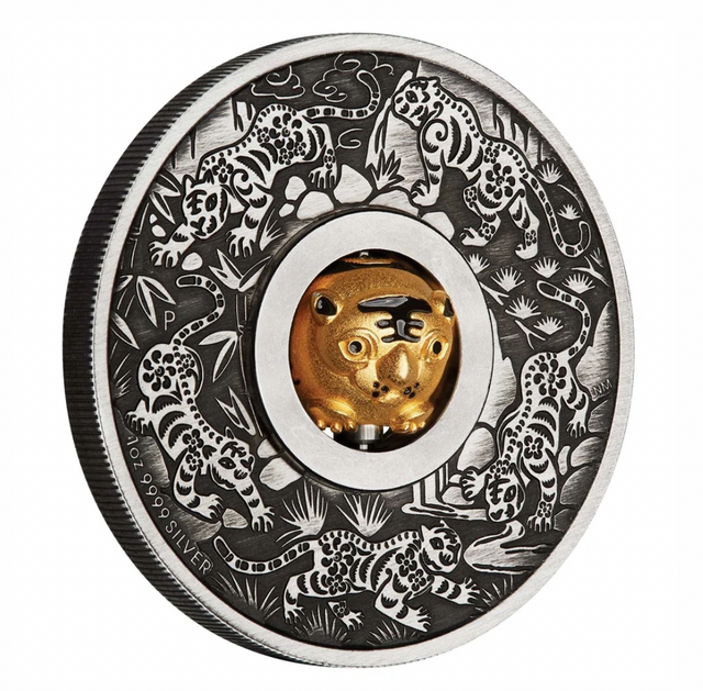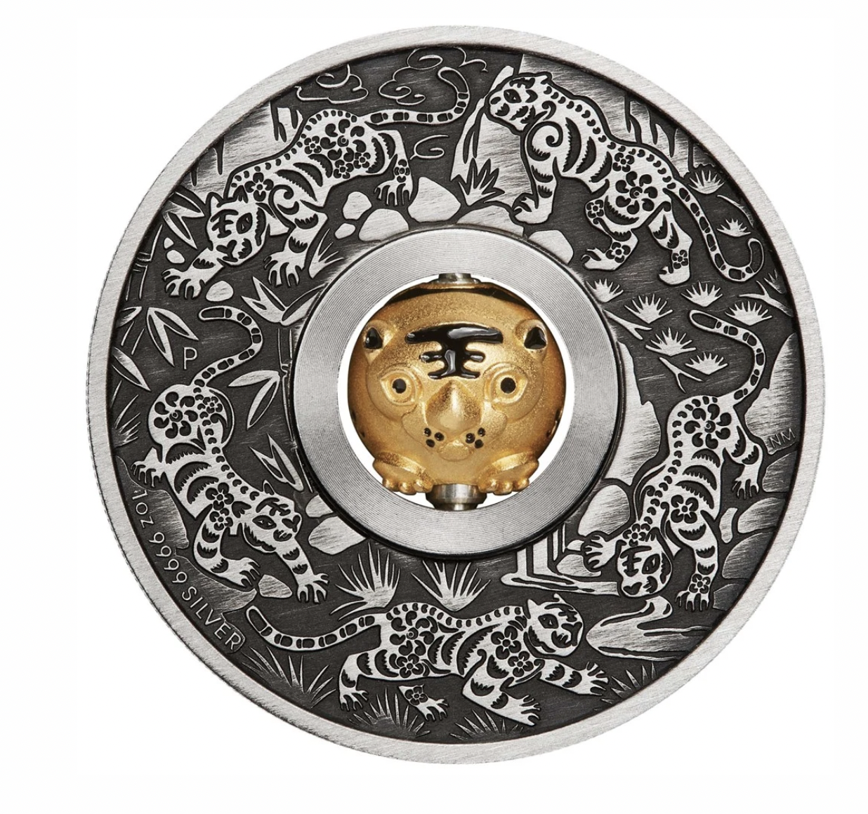 A delightful numismatic celebration of the Year of the Tiger, this highly original antiqued silver coin features a novel rotating charm in the form of the auspicious lunar animal.