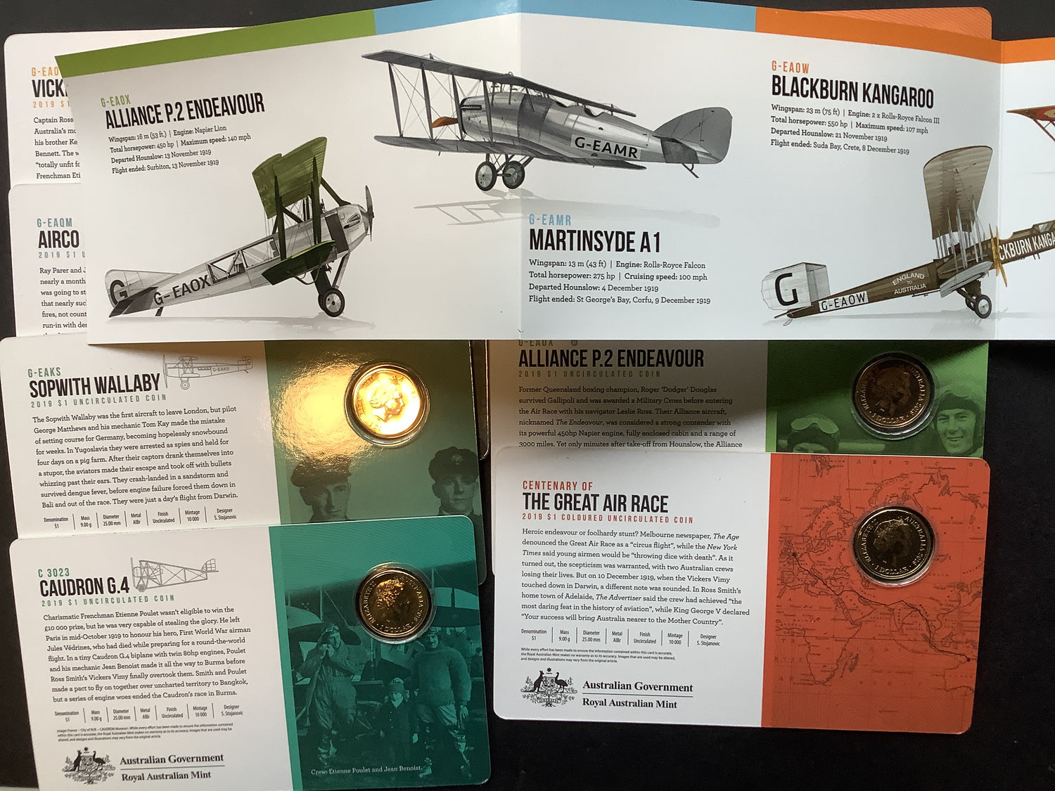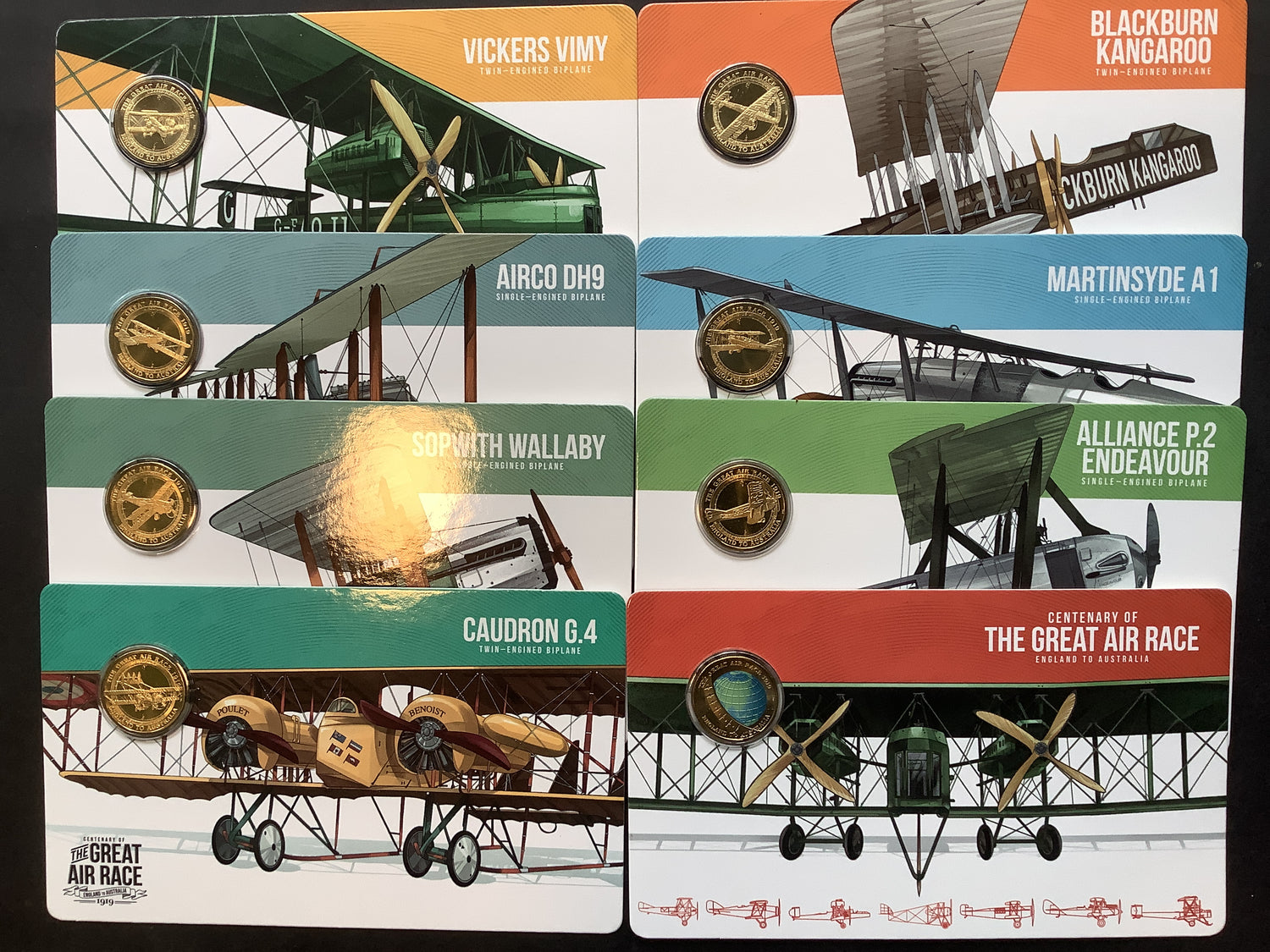 2019 Centenary of the Great Air Race England to Australia. 8 Coin Tin Set.