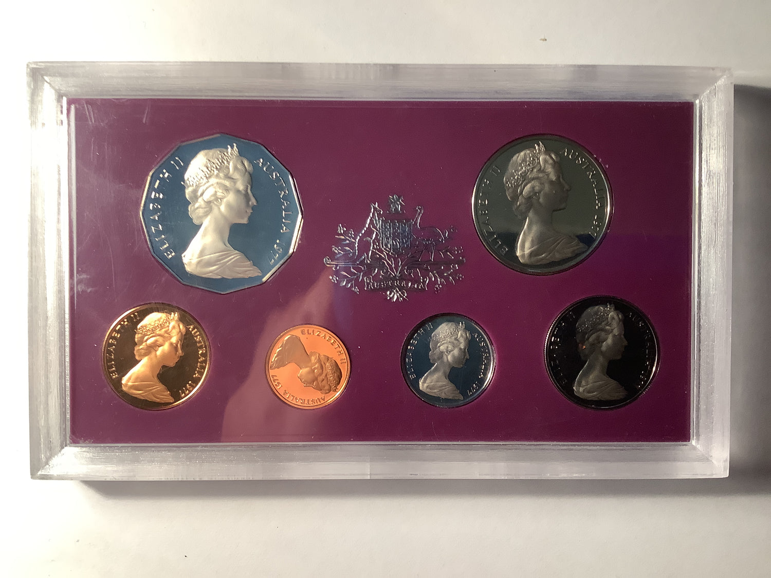 Includes six Australian coins struck to proof quality and housed in a clear perspex display case.