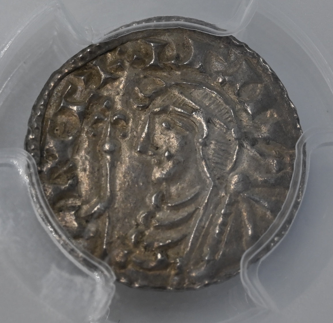 A remarkable silver penny from the reign of King Cnut struck at the London Mint. Graded MS62, this rare piece of early British history is highly desirable among collectors.
