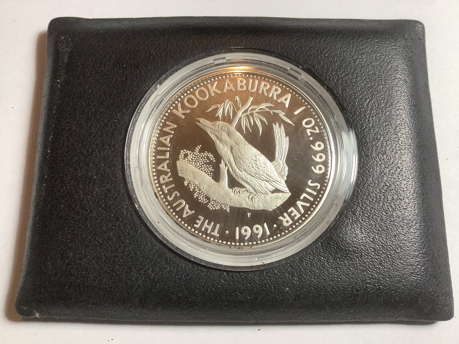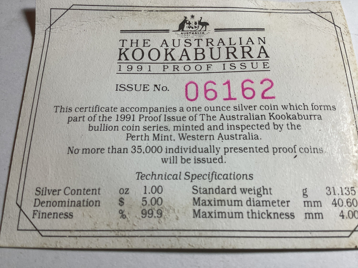 1991 Kookaburra 1 Ounce Silver Proof Coin.