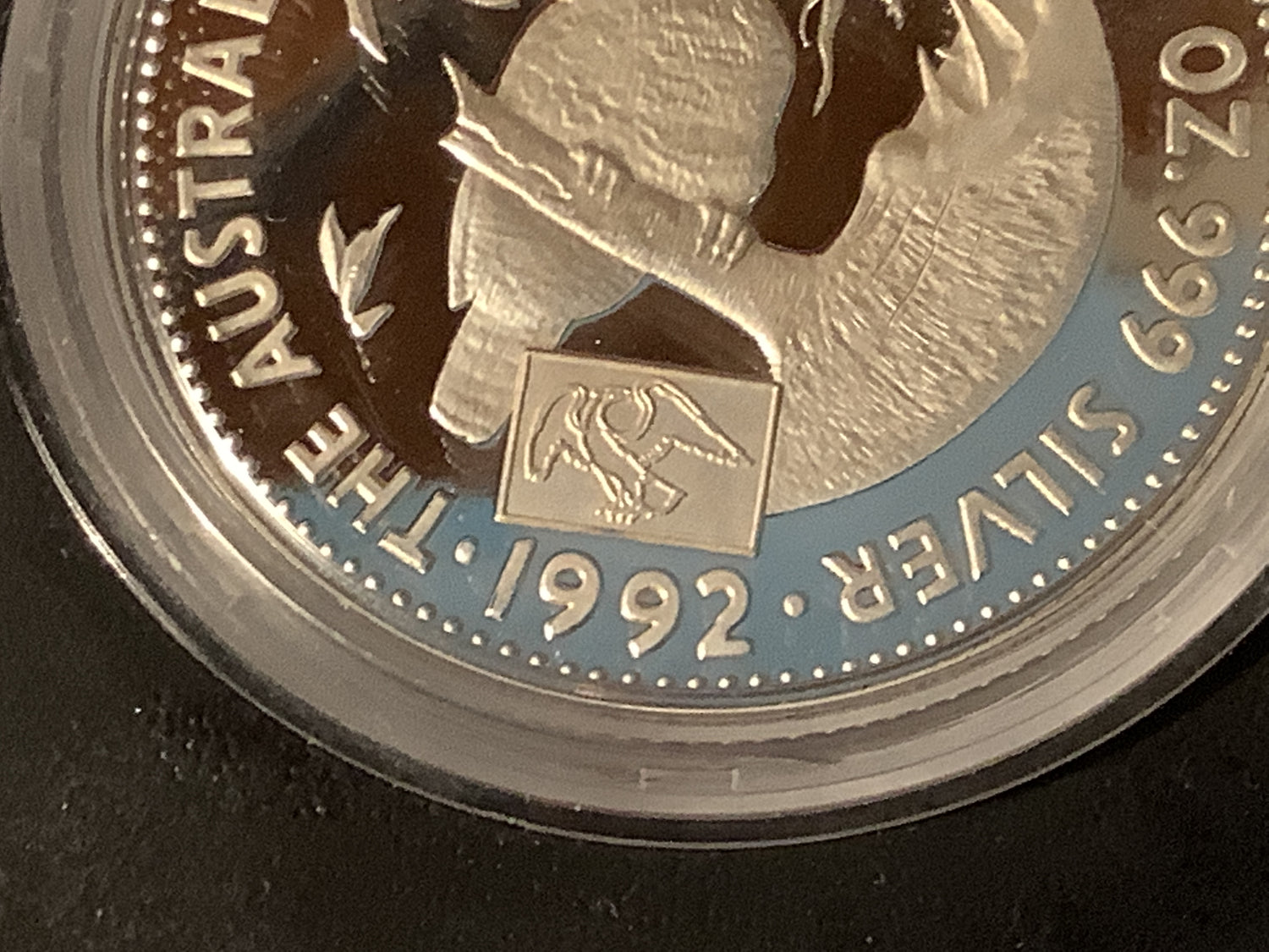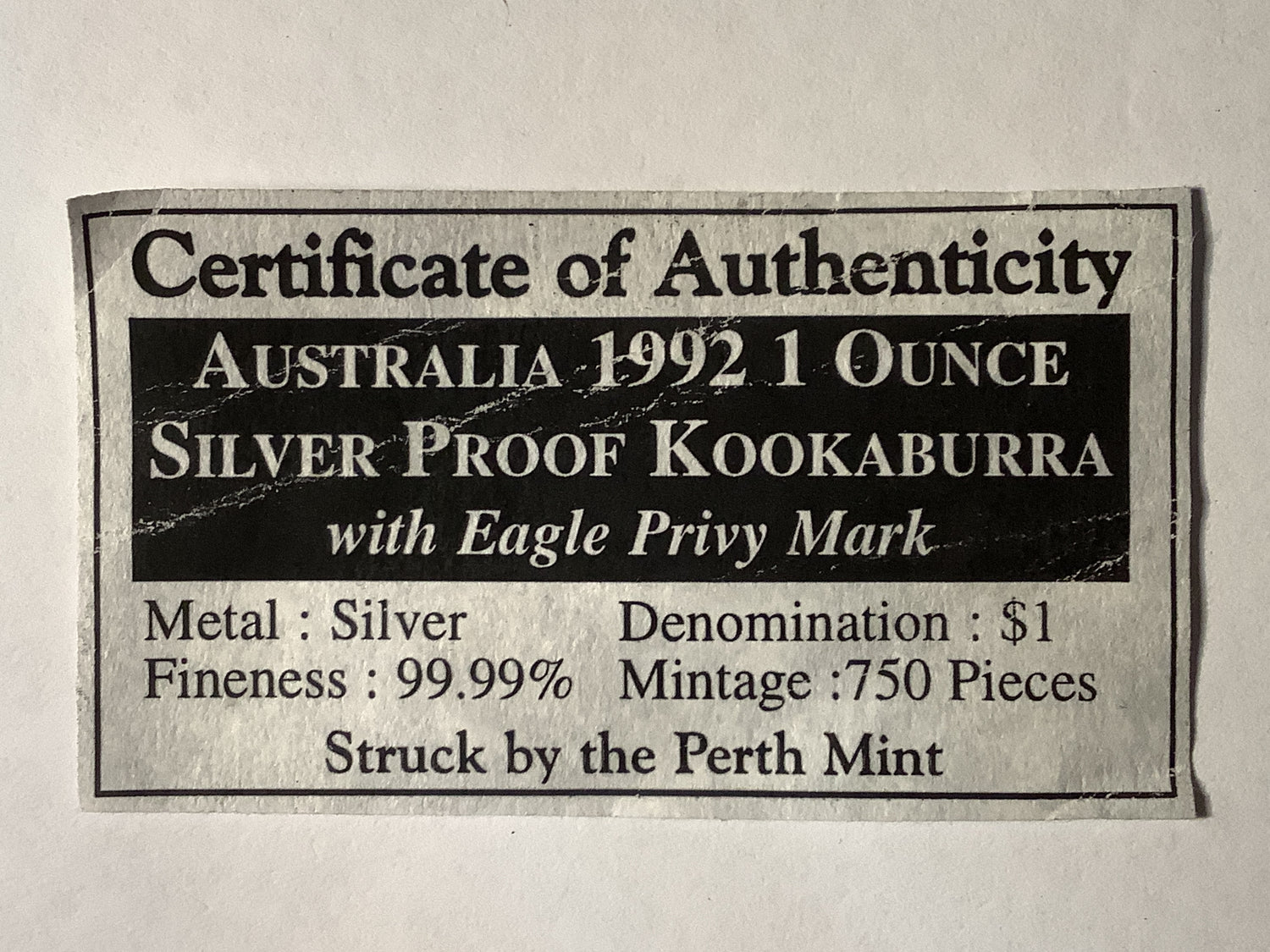 1992 $1 Silver Proof Kookaburra with Eagle Privy Mark.