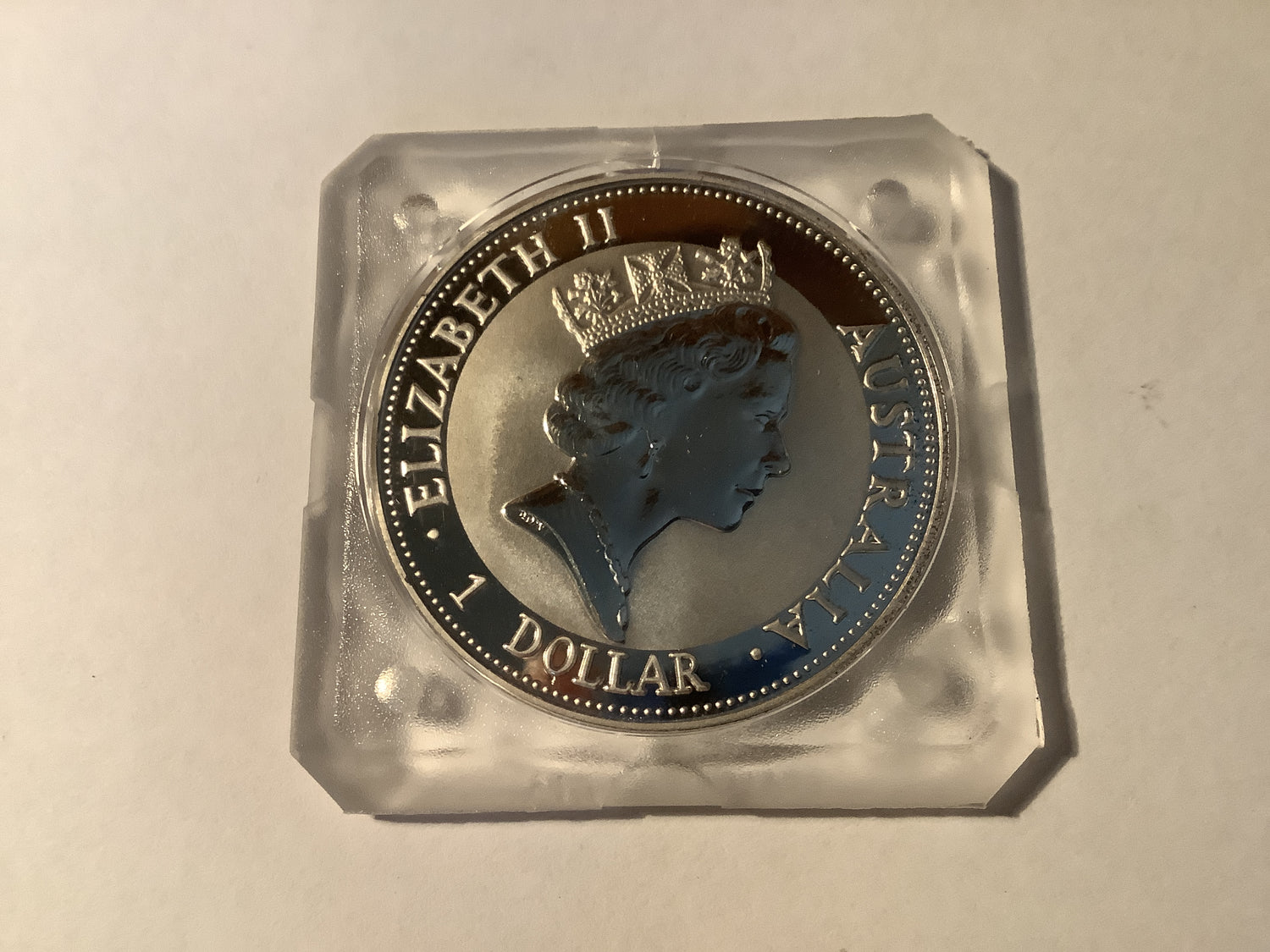 1993 $1 1 ounce silver encapsulated Kookaburra.