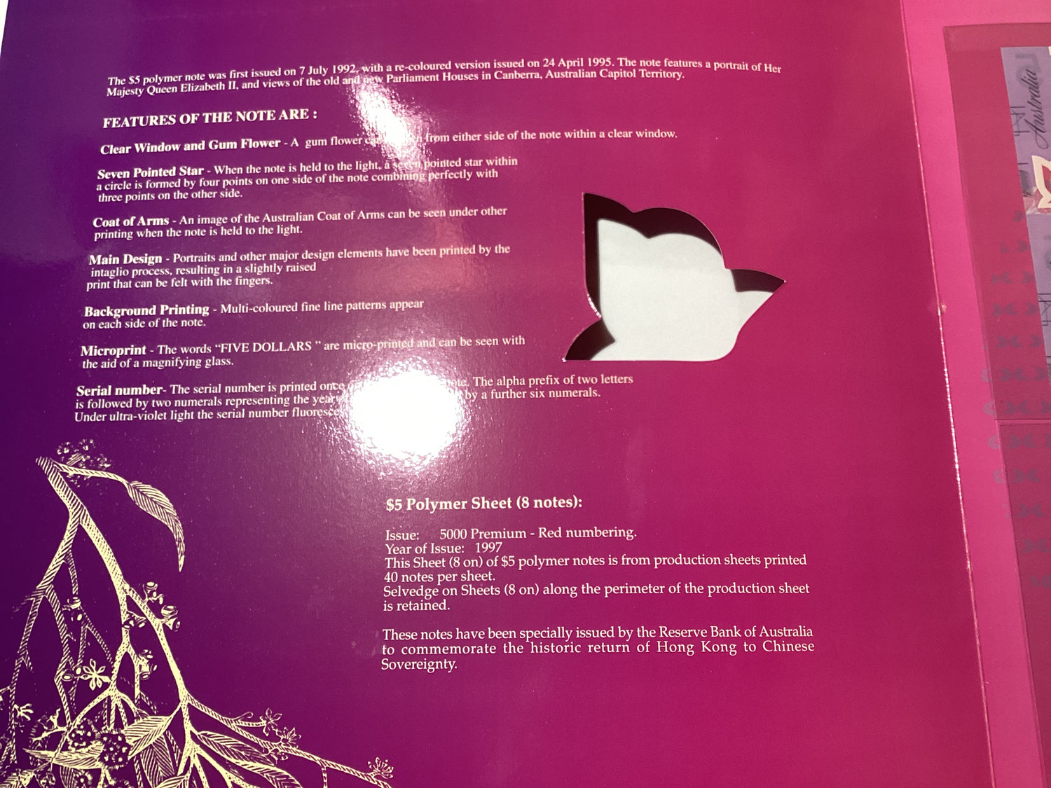 Released in 1997 by Note Printing Australia. These Sheets of 8 $5 Uncirculated Banknotes were released to commemorate the return of Hong Kong to China.