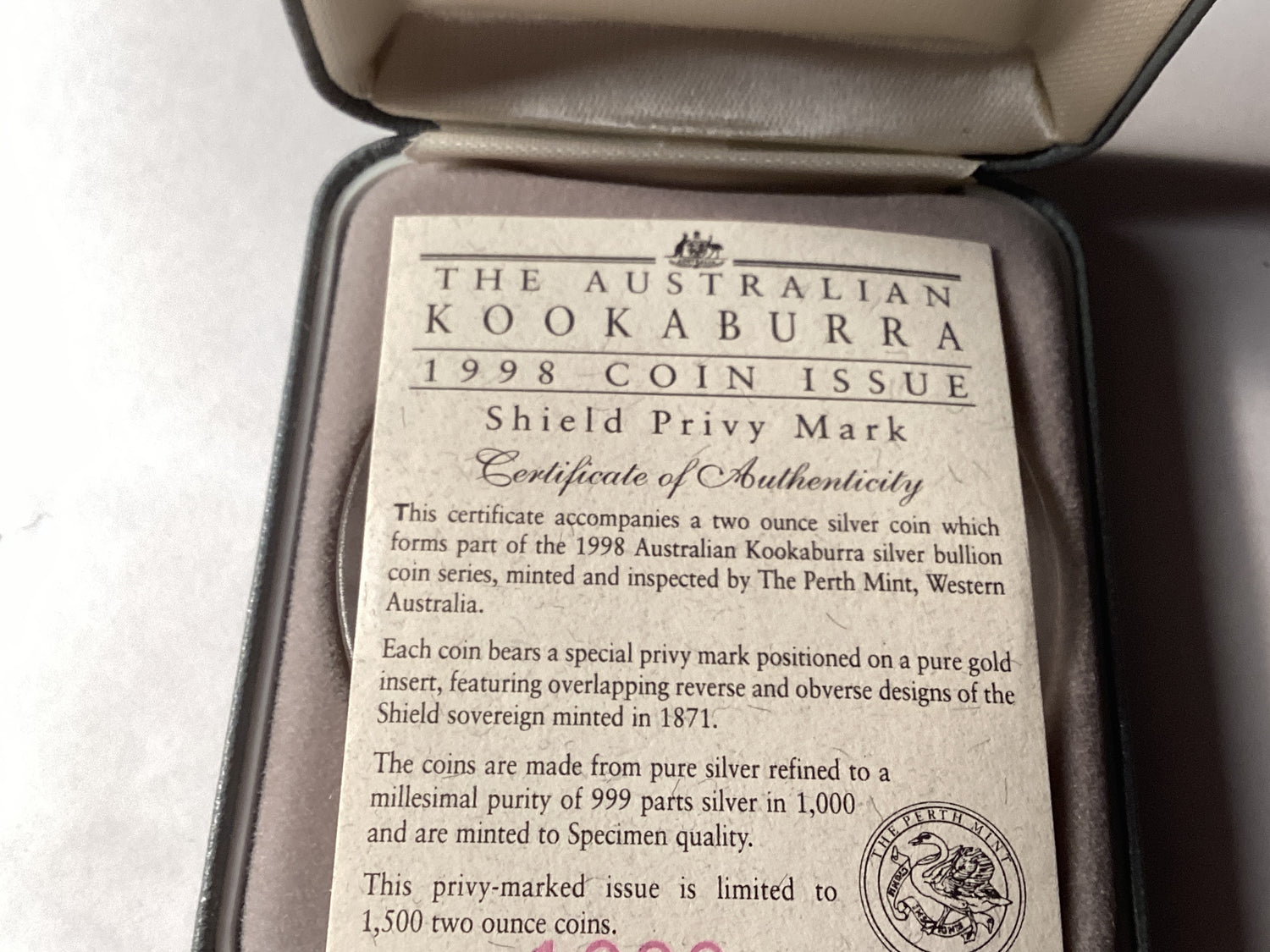 1998 $2 Kookaburra. 2oz Silver Coin. ‘Shield Sovereign’ Privy Mark. is backordered and will ship as soon as it is back in stock.