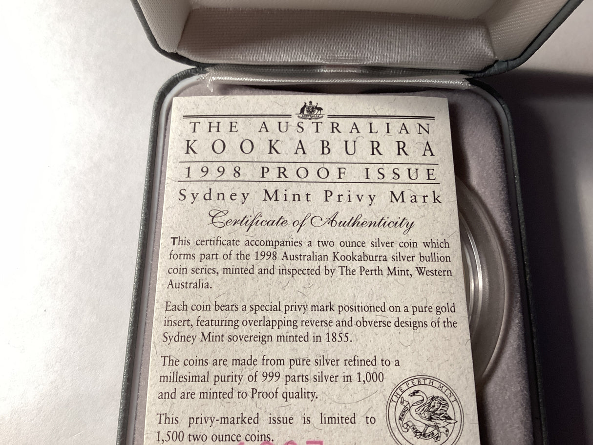 Introducing the 1998 $2 Kookaburra 2oz Silver Coin, featuring a ‘Sydney Mint Sovereign’ privy mark.