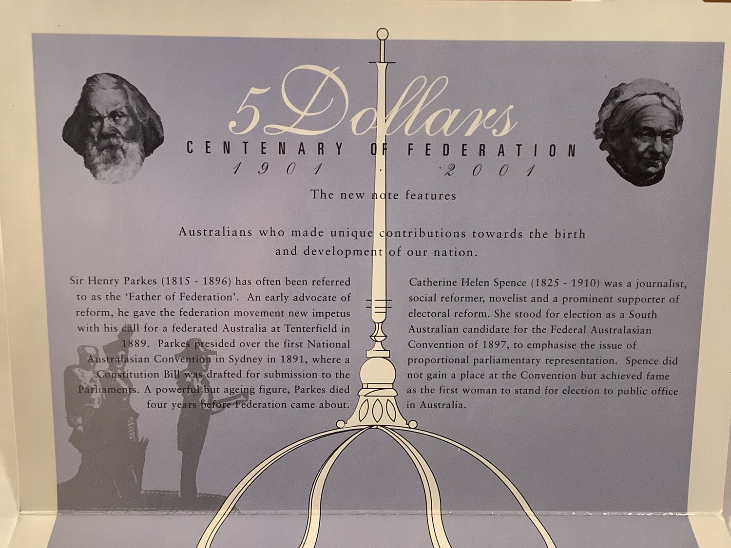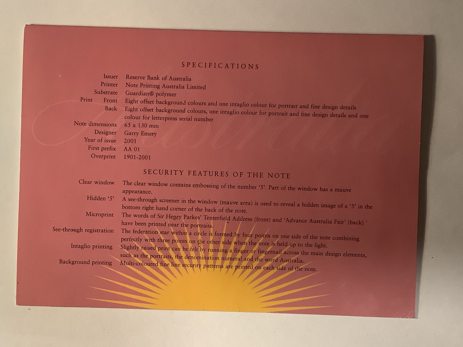 This collectors folder and $5 note was released by Note Printing Australia. The note contains an overprint stating '1901-2001'.