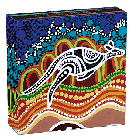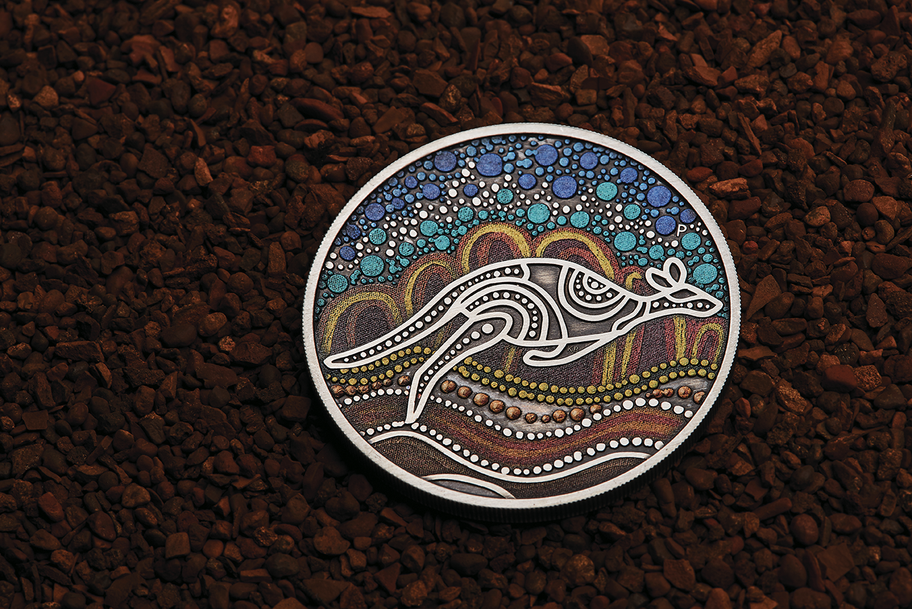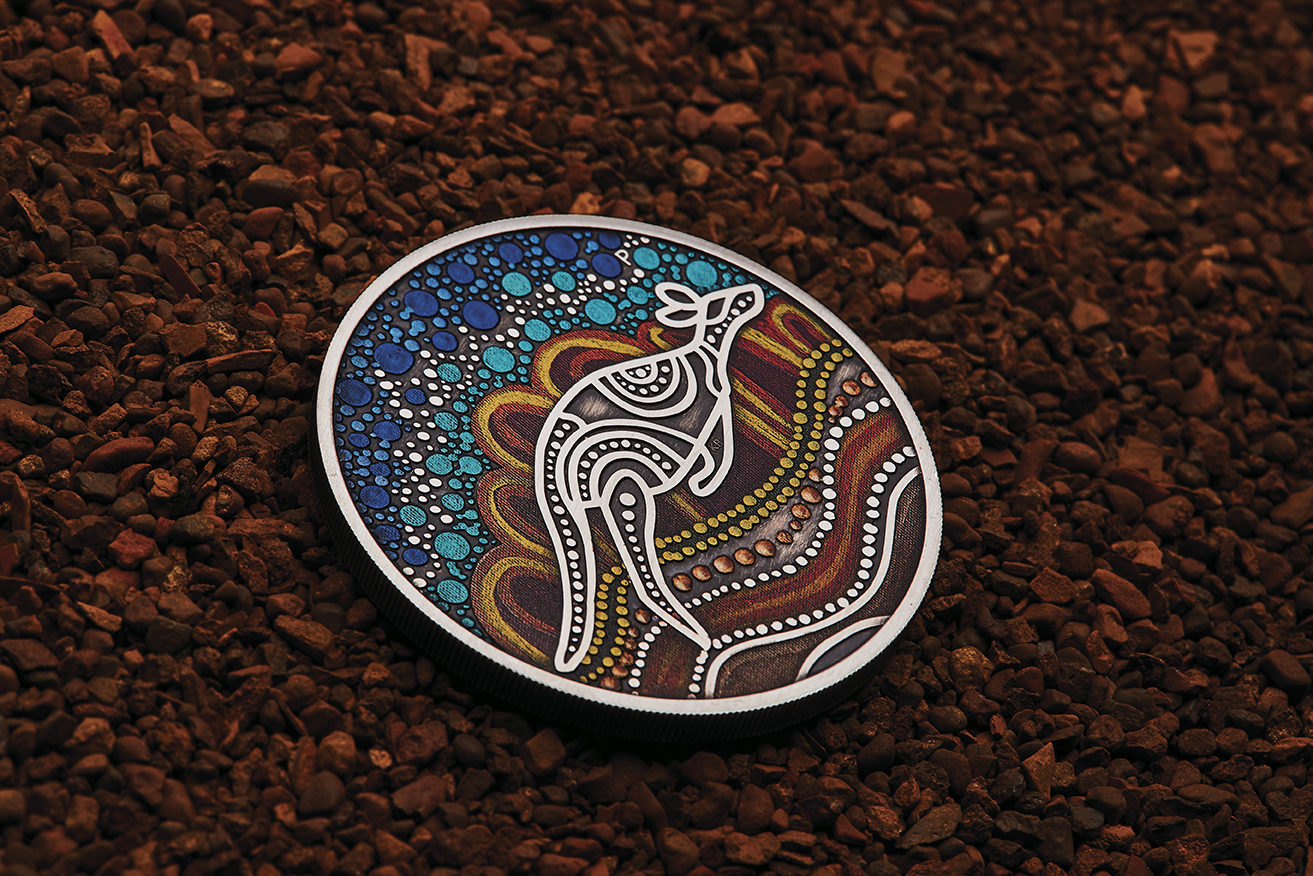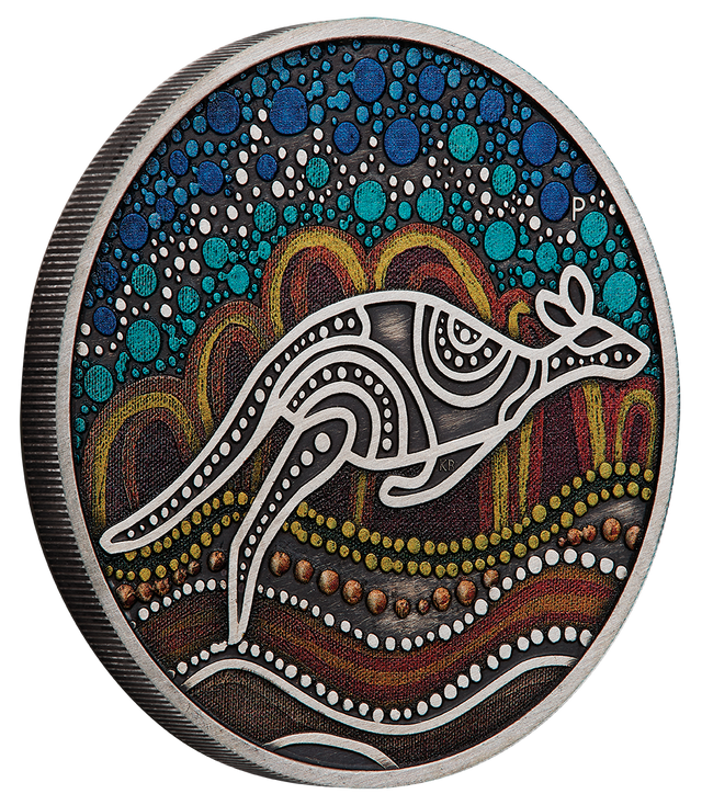 The second of its kind, this 2oz silver antiqued coloured coin features an original coloured painting of a kangaroo by Kevin Bynder, a proud Whadjuk-Yuet-Ballardong man.