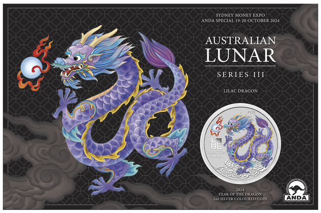 The Perth Mint will release no more than 5,000 of the Sydney Money Expo ANDA Special Australian Lunar Series III 2024 Year of the Dragon 1oz Silver Lilac Coloured Coin in Card in individual packaging from a maximum mintage of 200,000.